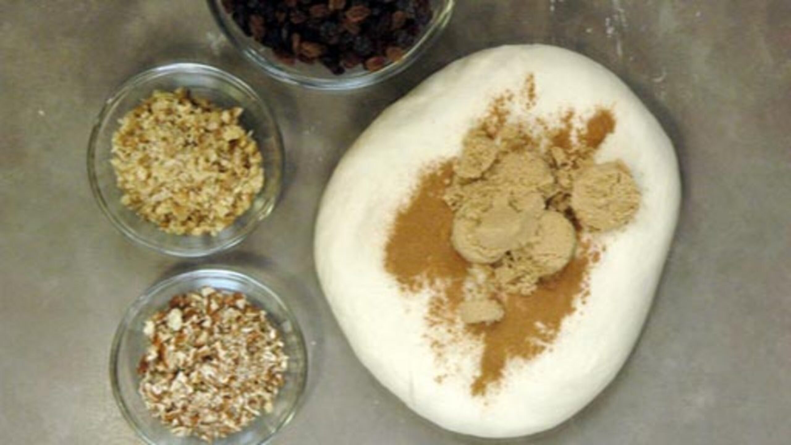 Flatten the dough slightly and add the cinnamon, brown sugar and nuts. Fold and continue to knead just until everything is incorporated. Lightly dust the counter and dough as needed, but only if the dough is overly sticky.
