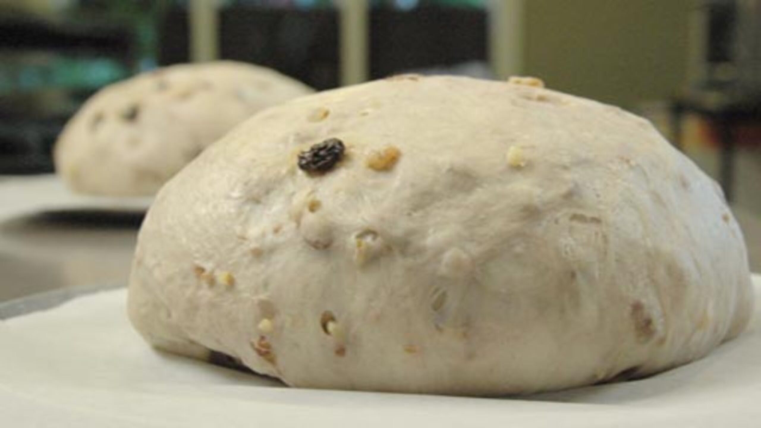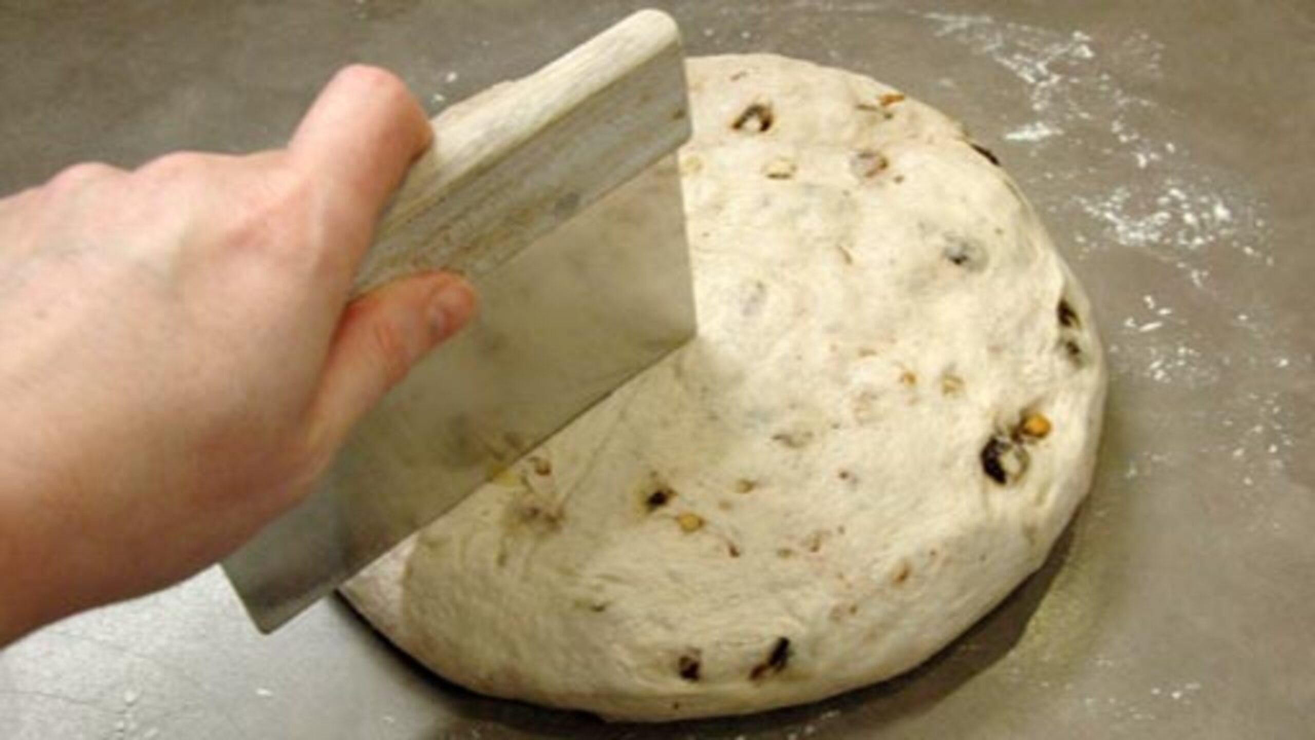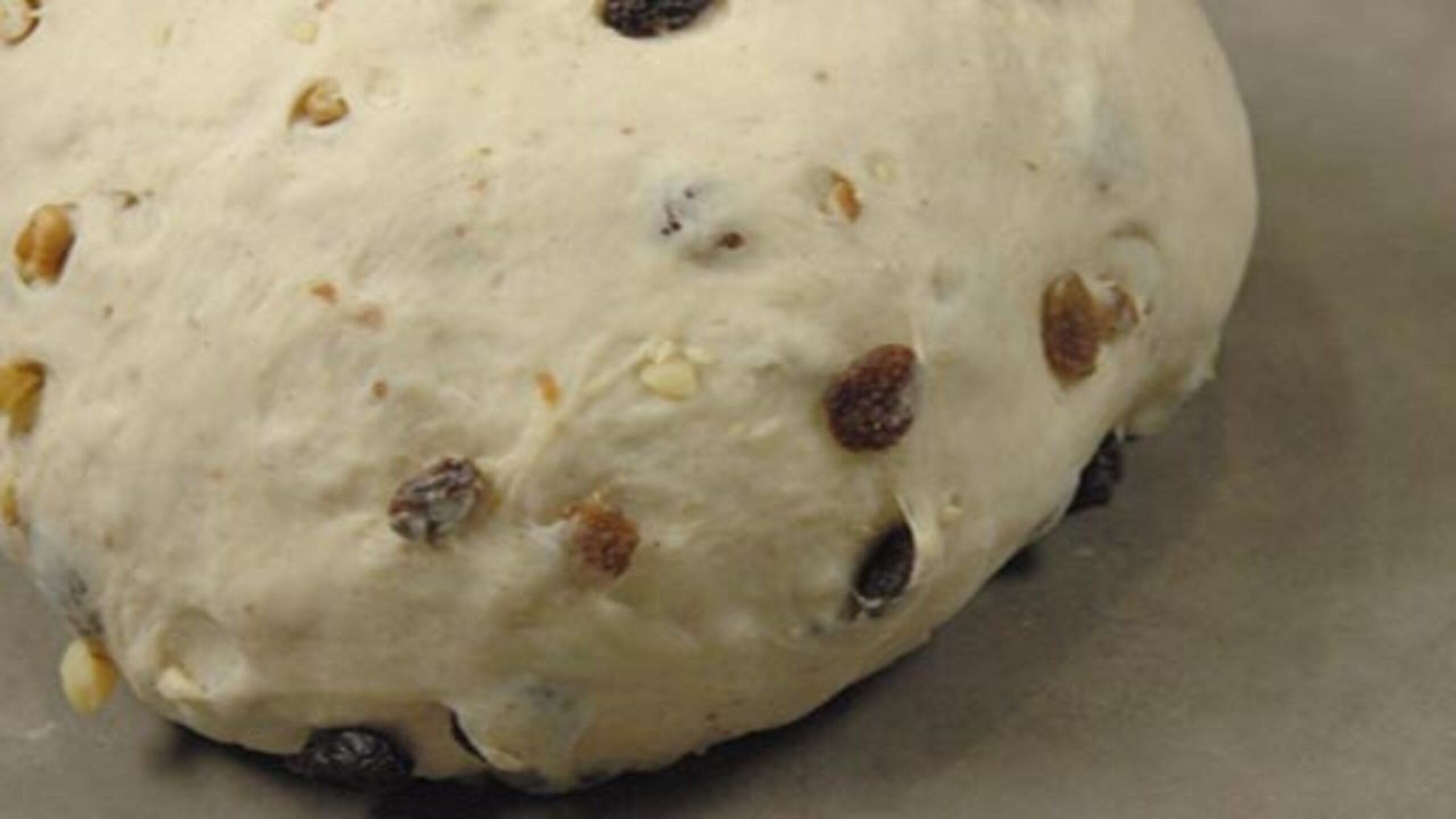 Flatten the dough slightly and knead the raisins into the dough, working in batches if needed. Some of the raisins and nuts may fall out but, again, don’t worry. Just press them in at the end. Form into a round.