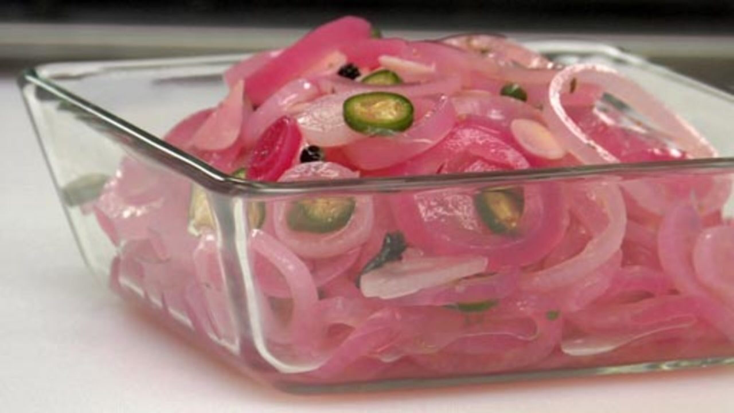 Add the onions to the marinade and toss to combine. Cover and let marinate in the refrigerator for at least 4 hours. During marinating, both the onions and marinade will turn bright pink. These onions will keep for at least a week in the refrigerator.