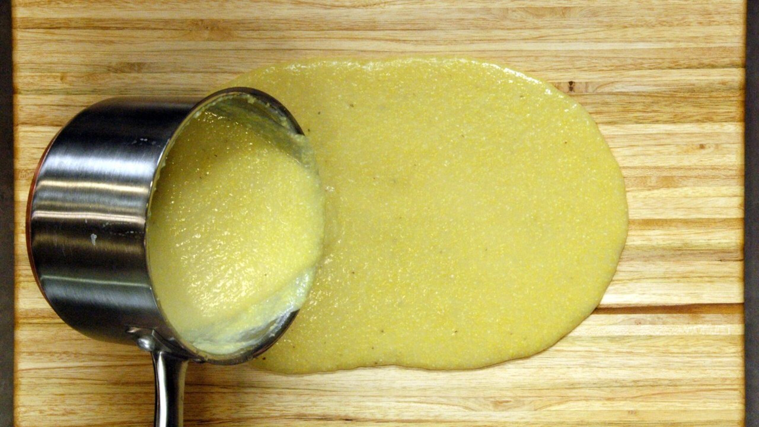 Once the polenta has cooked, pour it onto a large, clean cutting board or platter.