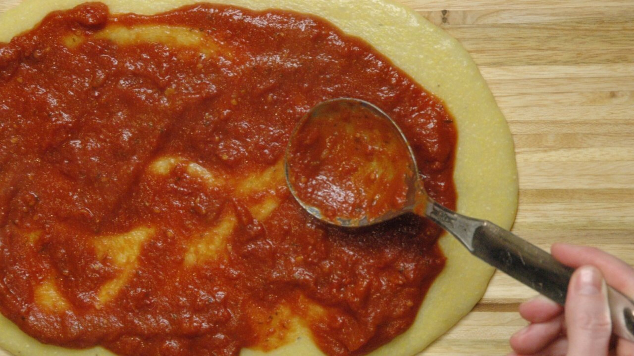 Once the polenta has been poured onto the board, the next step is to add the tomato sauce. Spoon the sauce onto the polenta, leaving about 1" -inch of the border blank.