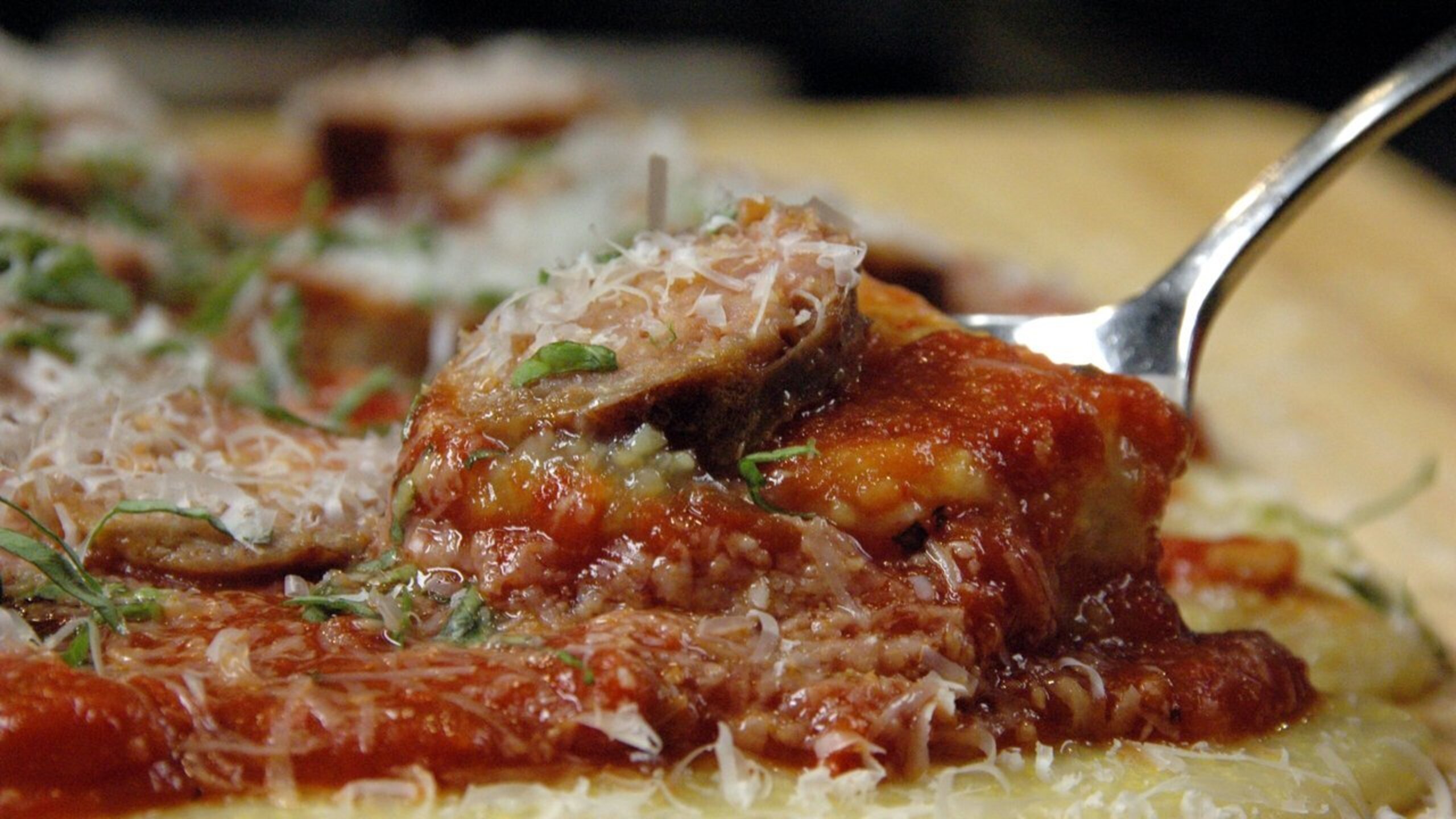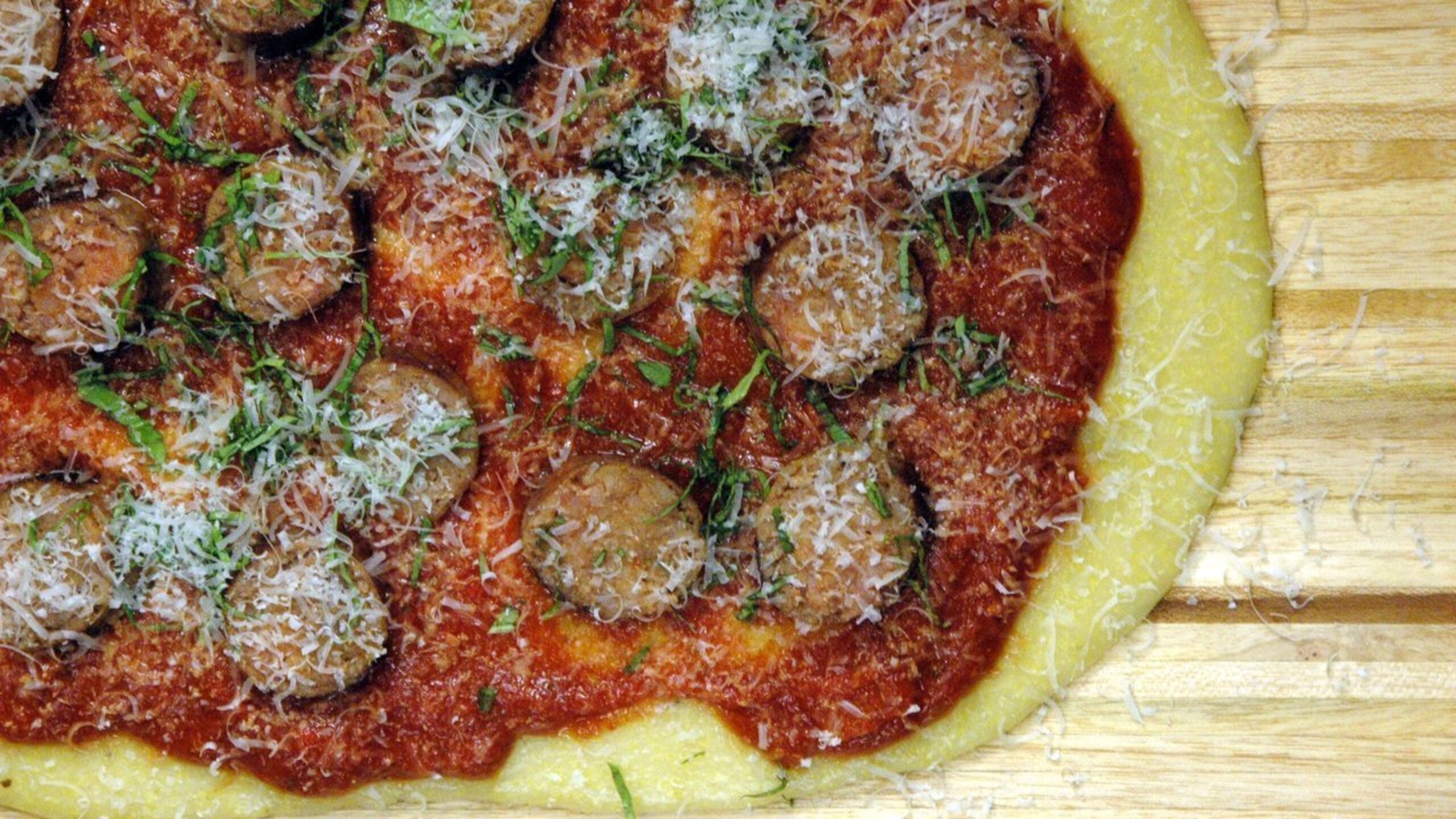 To finish the polenta, slice the sausages on the bias. Place over the tomato sauce and top with some chopped basil.