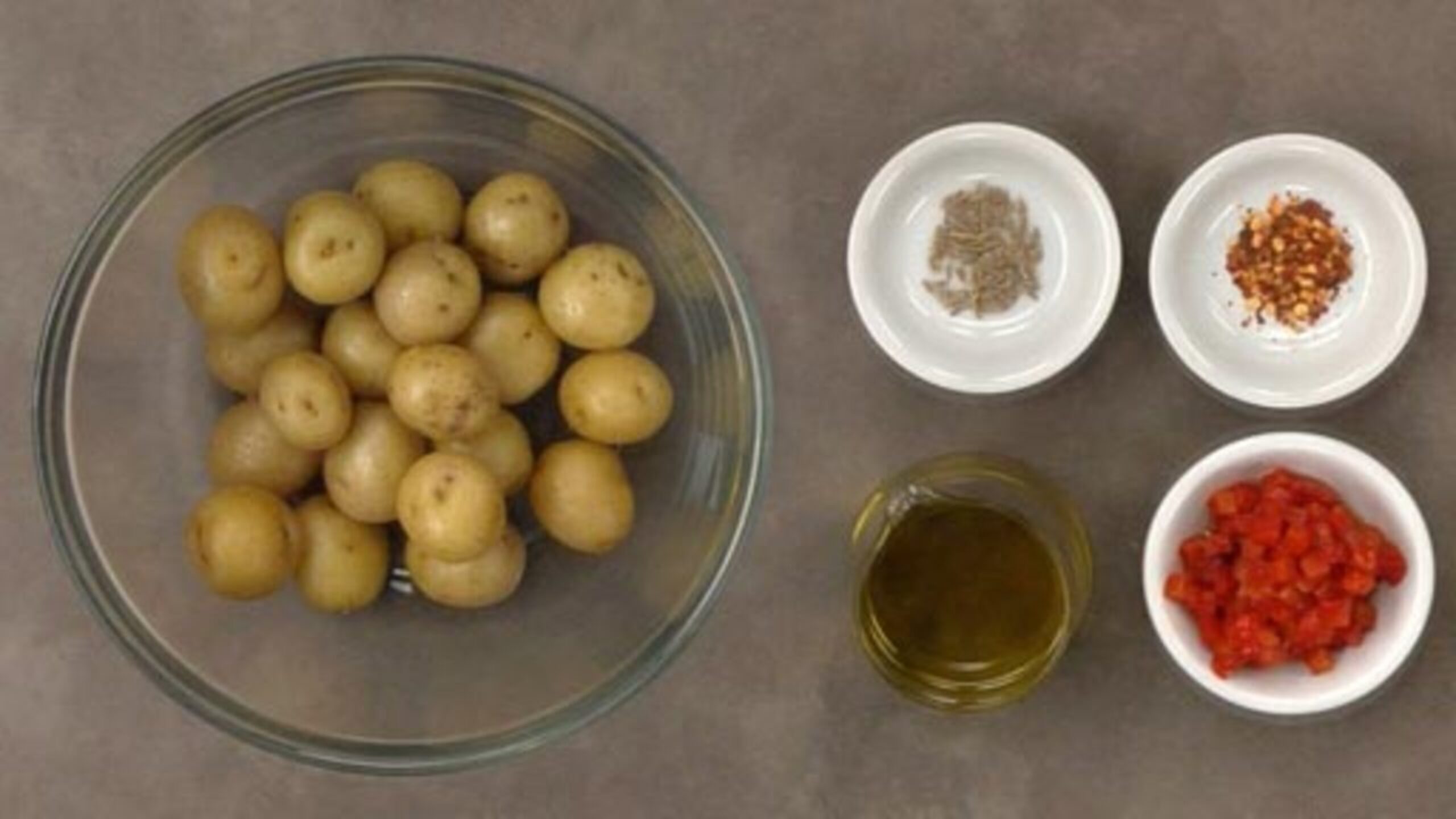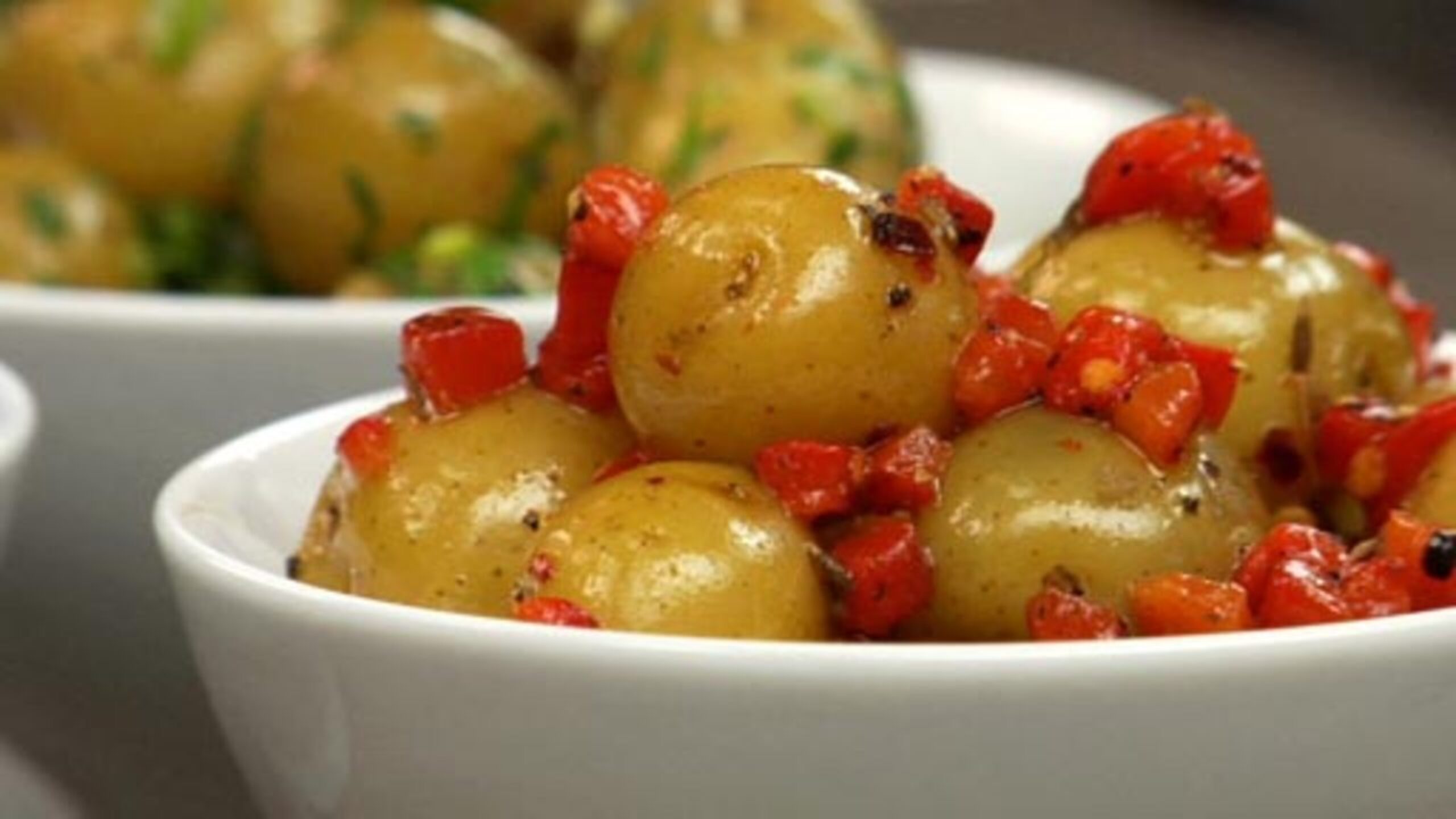 Once the potatoes are cooked through, remove them from the steaming basket and place into a large bowl. Add the roasted red pepper, chili flakes and drizzle with olive oil. Season with salt and pepper to taste and toss to coat. Transfer to a serving bowl and serve.