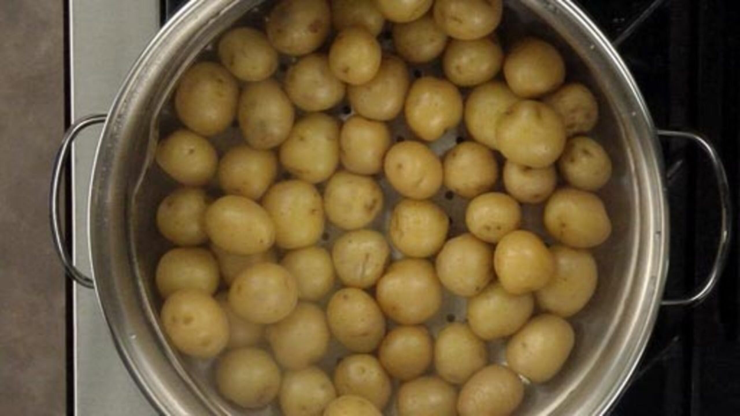 For even cooking, make sure to buy potatoes that are all relatively the same size. Wash the potatoes and place into the steaming basket. Sprinkle with a pinch of sea salt. Once the water is simmering, place the basket over the pot and cover with a lid. Steam until tender and cooked through, about 20 minutes or so.