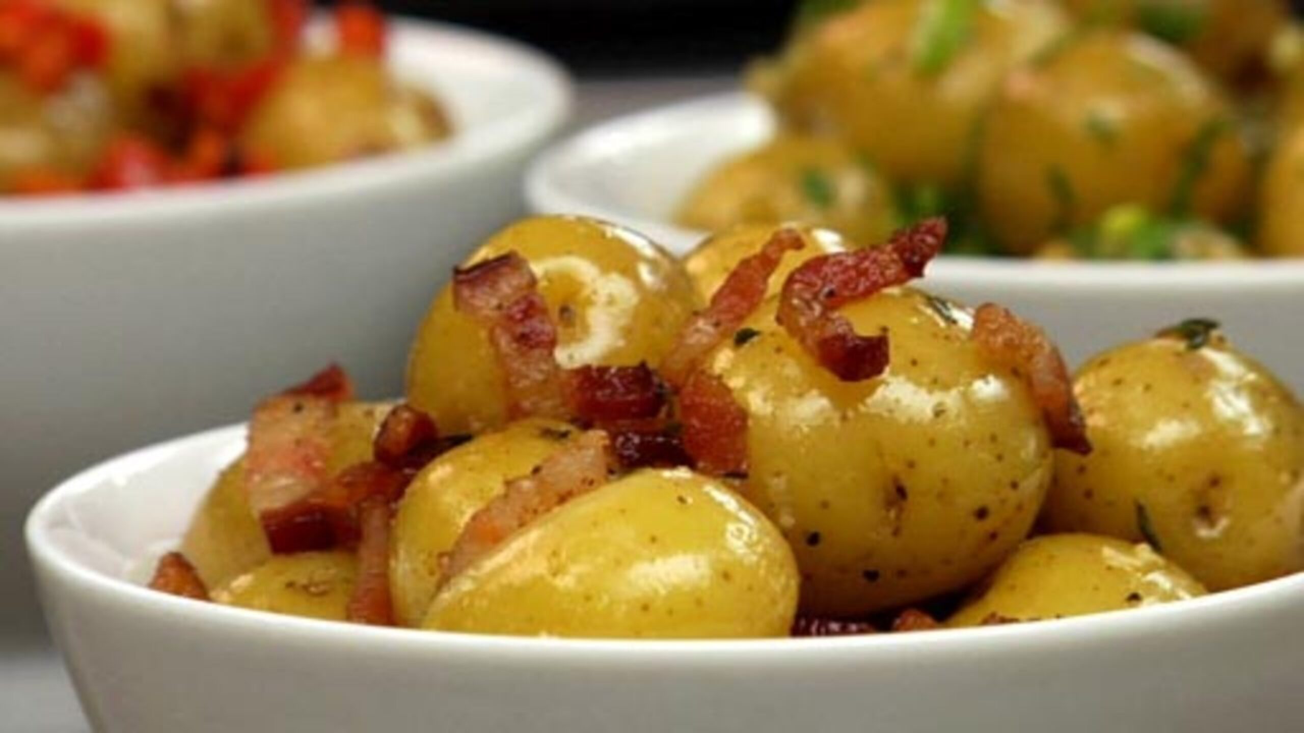 Once the potatoes are cooked through, remove them from the steaming basket and place into a large bowl. Add the bacon and thyme and drizzle with olive oil. Season with salt and pepper to taste and toss gently to coat. Transfer to a serving bowl and serve.