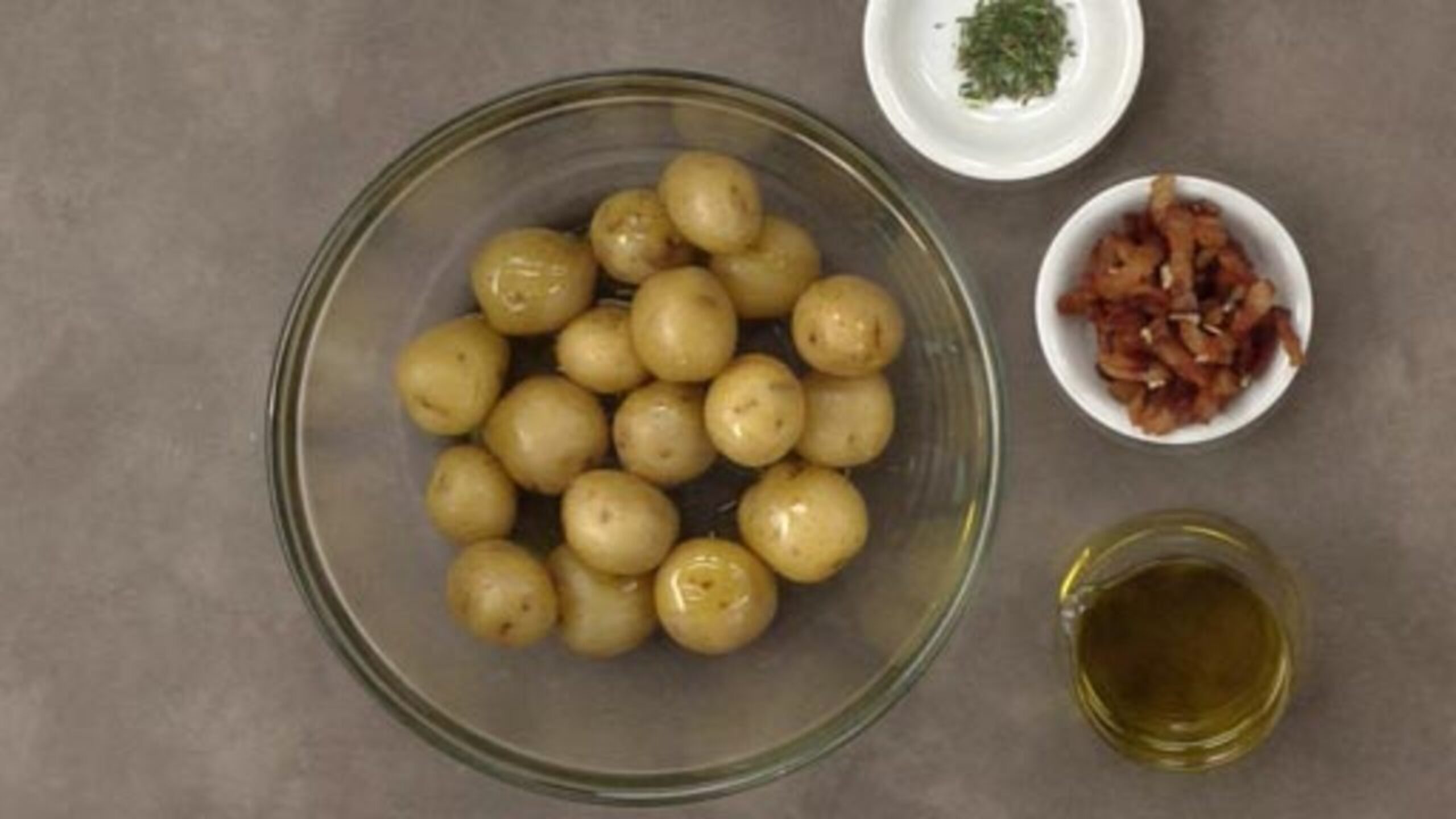 While the potatoes are steaming, cut the bacon into lardons and fry over medium heat just until it is crispy. Drain and set aside.