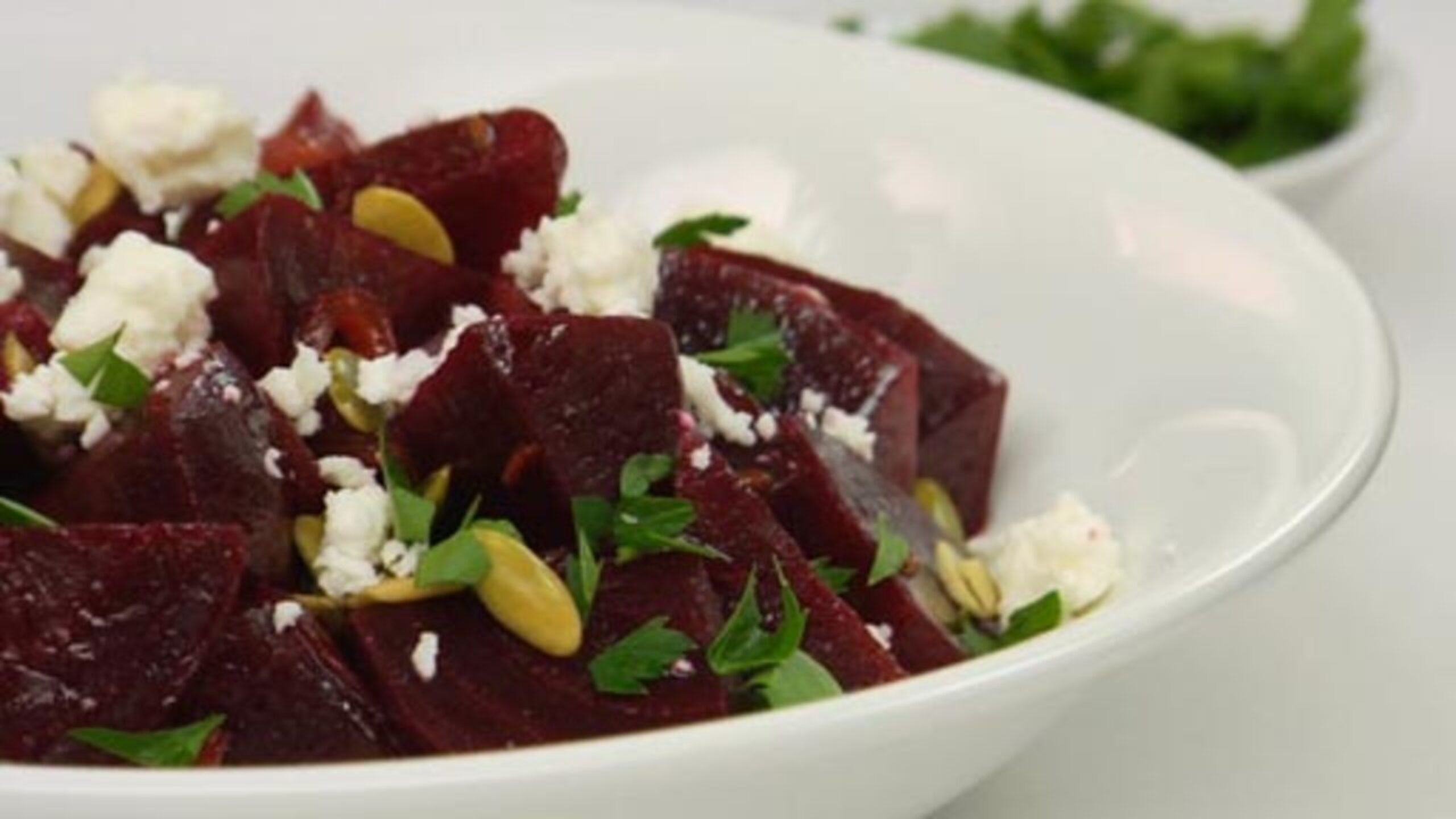 Divide some of the beets among the plates. Sprinkle with the pumpkin seeds, feta cheese, sliced onions, chilies and parsley and repeat until the ingredients are used up. Serve.