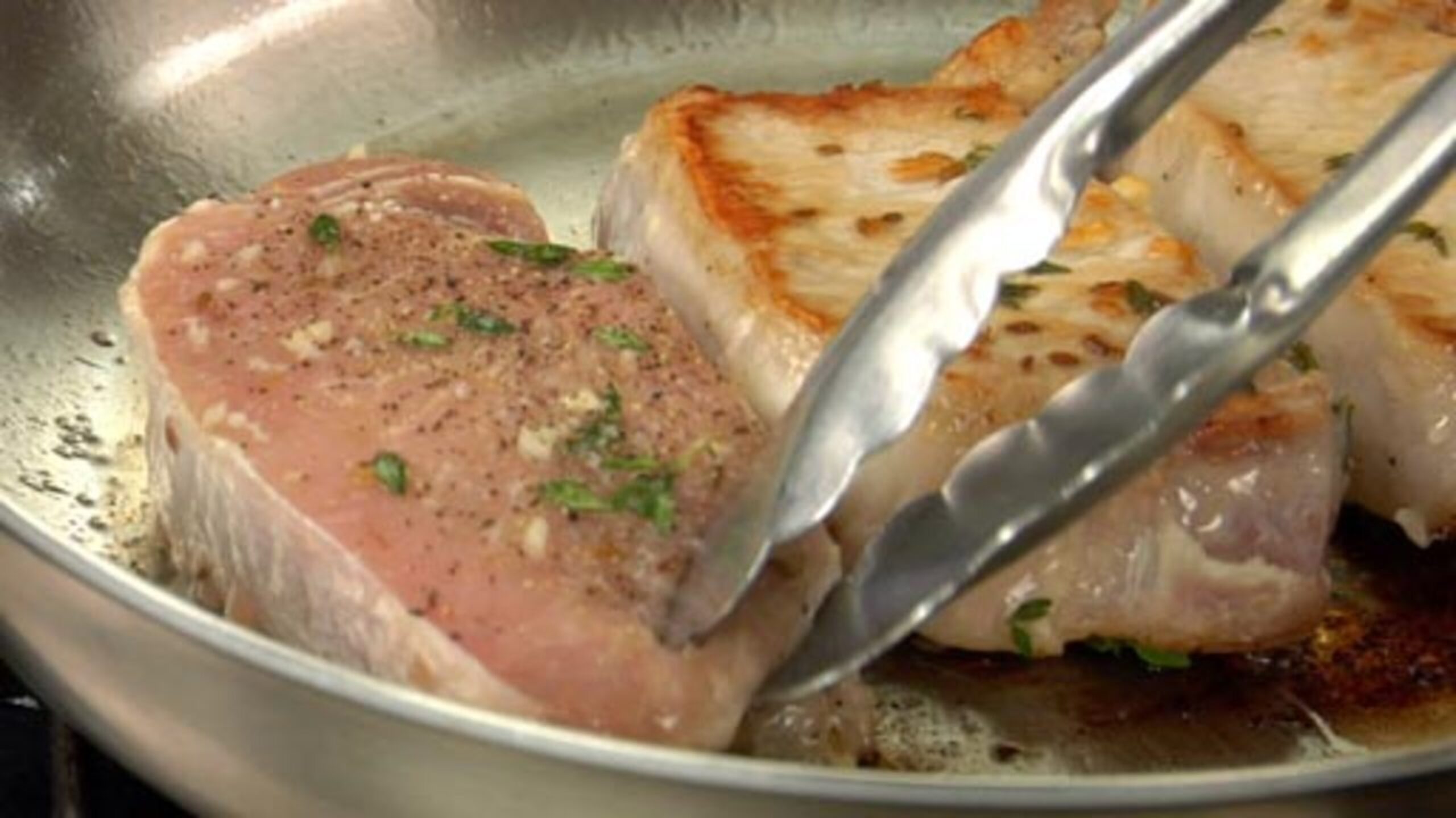 Once the pan is ready, add the oil to the pan, followed by the pork chops. Lower the heat to medium and use the flip often method to cook the pork chops. Cook the pork chops for approximately 8 to 10 minutes or until just cooked through (the pork can be a tiny bit pink inside).