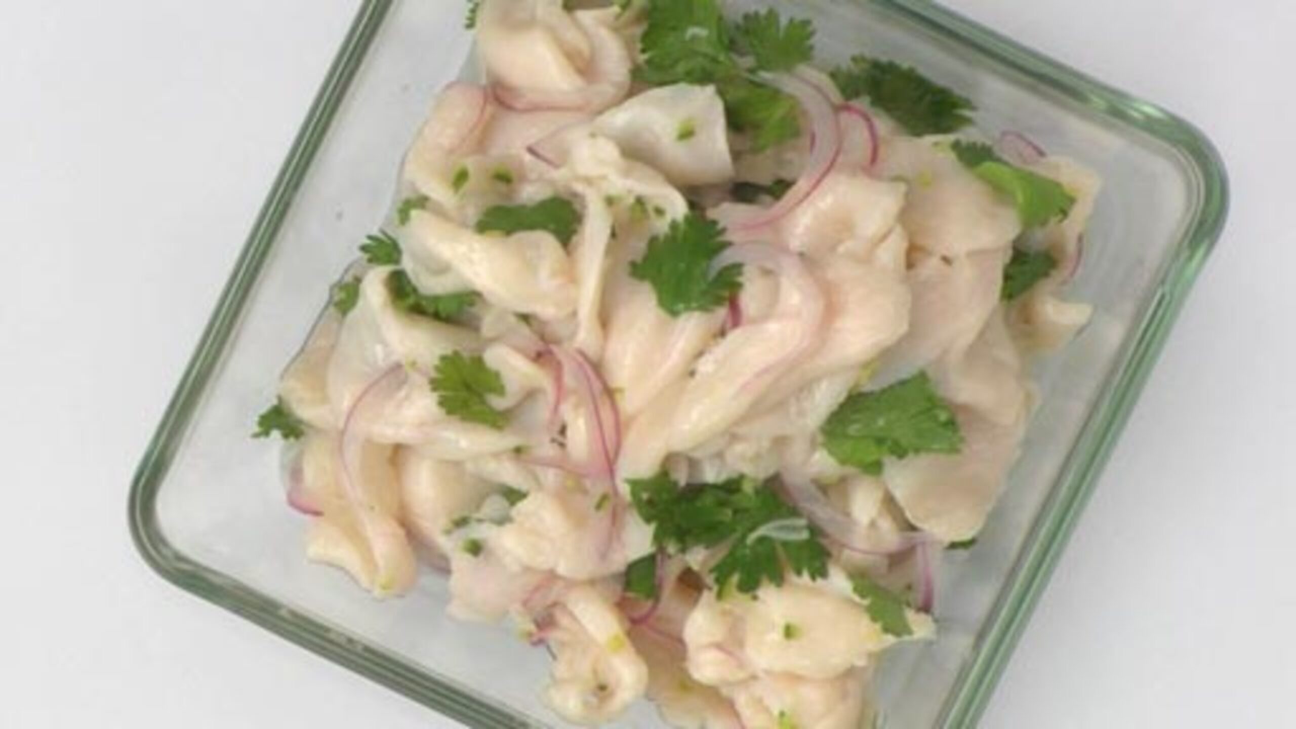 Slice the scallops horizontally, into thin, even pieces. Once done, transfer to the marinade, along with the sliced red onions. Toss to combine.