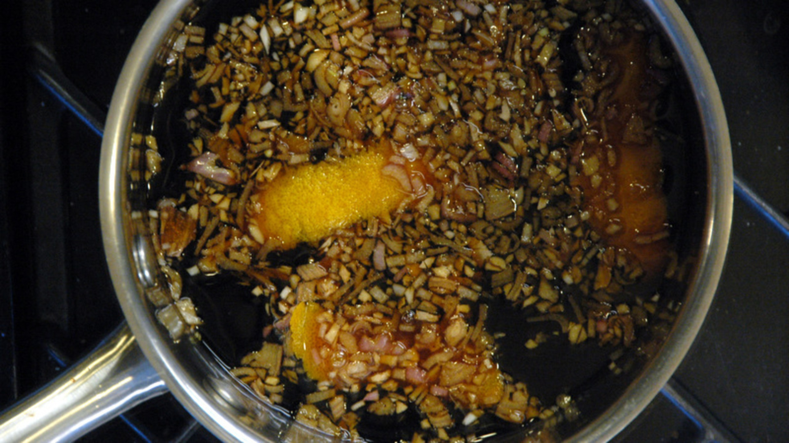Next, zest the orange. You want 3 thick strips that are roughly about 2" inches long and about 1/2" inch wide. Place them into the pot. Add the brown sugar, mirin, soy sauce and stir to combine. Next, add the beer and place over medium-high to high heat. Bring to a boil, stirring occasionally to ensure the sugar dissolves.