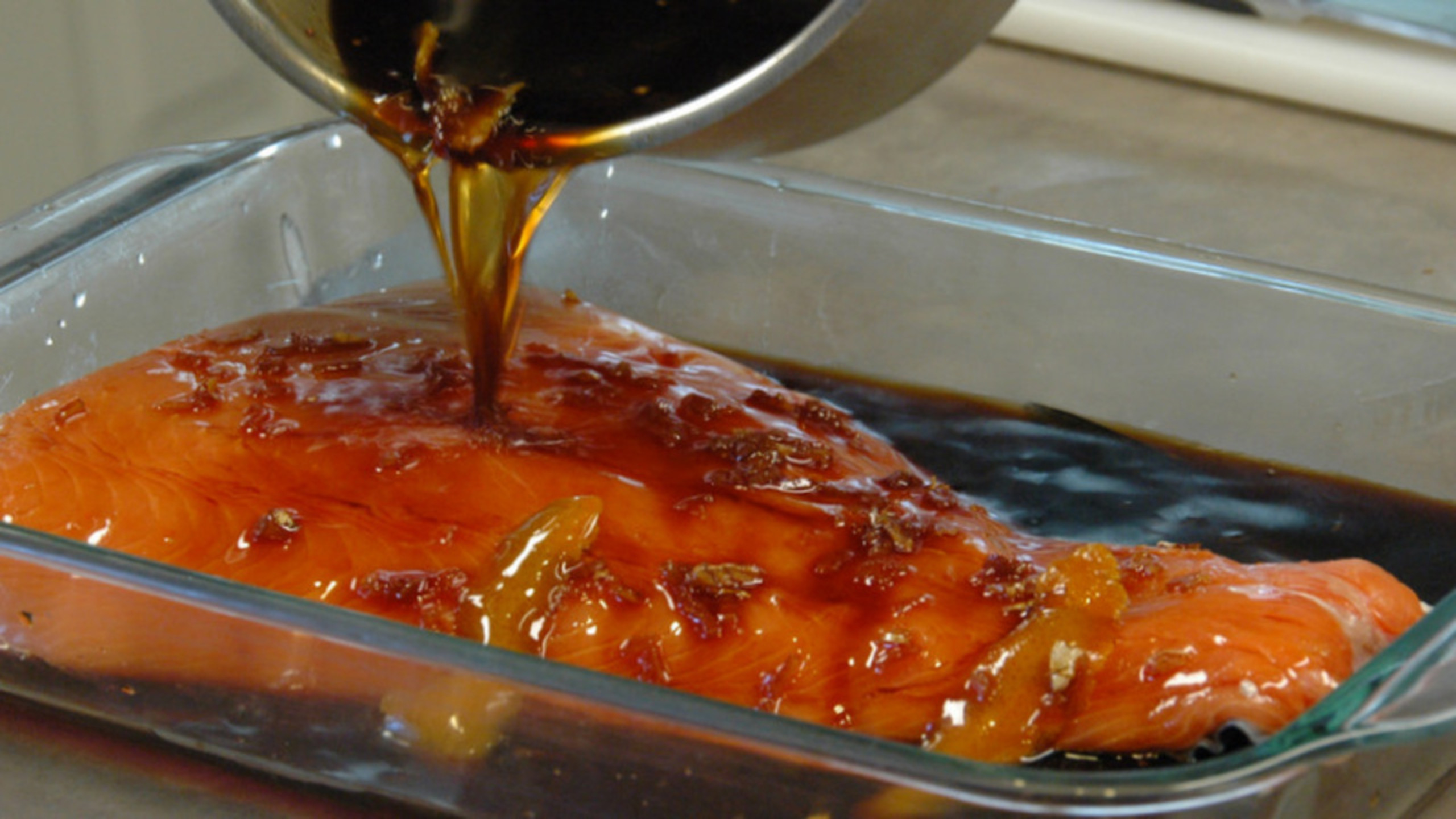 Remove the salmon from the marinade and let the excess marinade drain off. Place the fish onto a tray or large plate and transfer back into the refrigerator while you reduce the glaze.