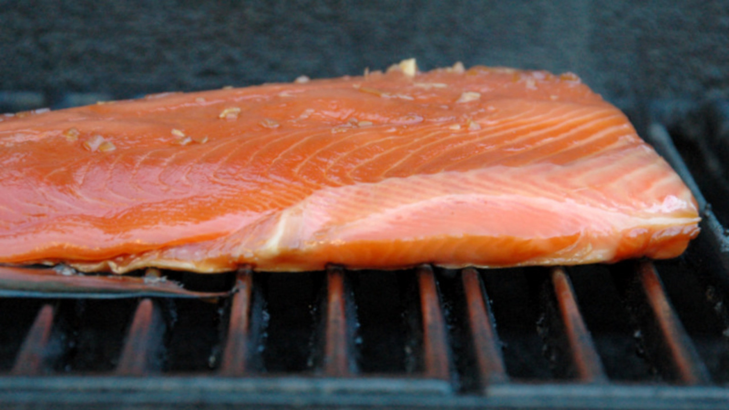 To cook the salmon, first oil the grate of your barbecue. Cook the salmon for about 10 to 15 minutes or until cooked to your liking. Note: If cooking fillets or steaks, these will need much less time – about 3 to 5 minutes per side. Again, time depends on how you like your fish cooked and how thick the pieces are.