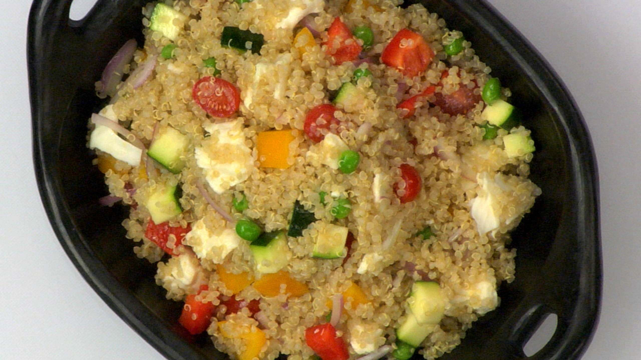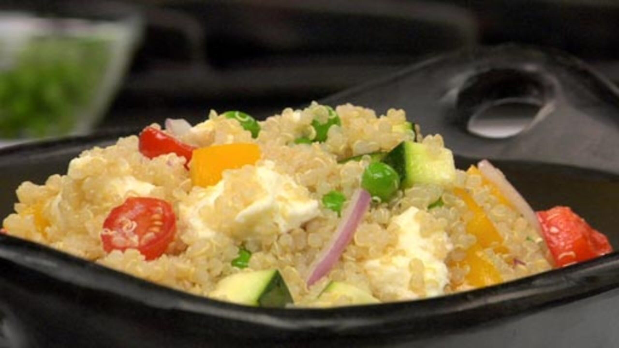 While the quinoa is cooking, measure out the peas. Cover with hot water for 1 to 2 minutes. Drain and set aside.