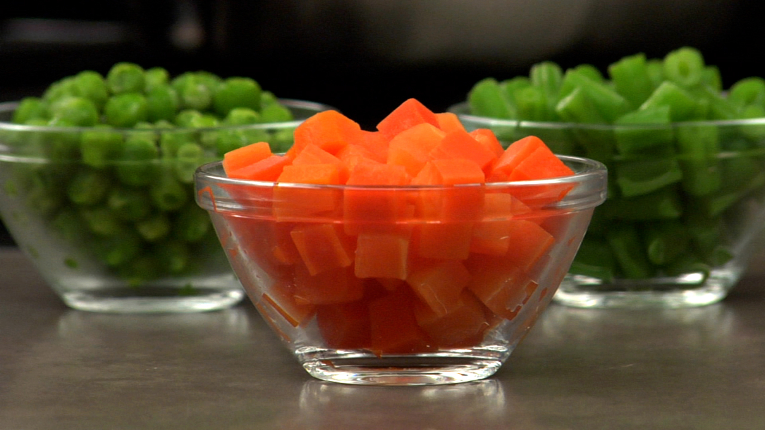 In the meantime, wash and peel the carrots. Clean and trim the beans. Cut the carrots and beans into small dice, about the same size as the peas. Set up an ice bath. Par-cook the carrots and beans in the cooking liquid. Once the vegetables are almost tender, transfer them to the ice bath to stop the cooking process. Once cool, drain and set aside. Reduce the heat to low to keep the cooking liquid hot.