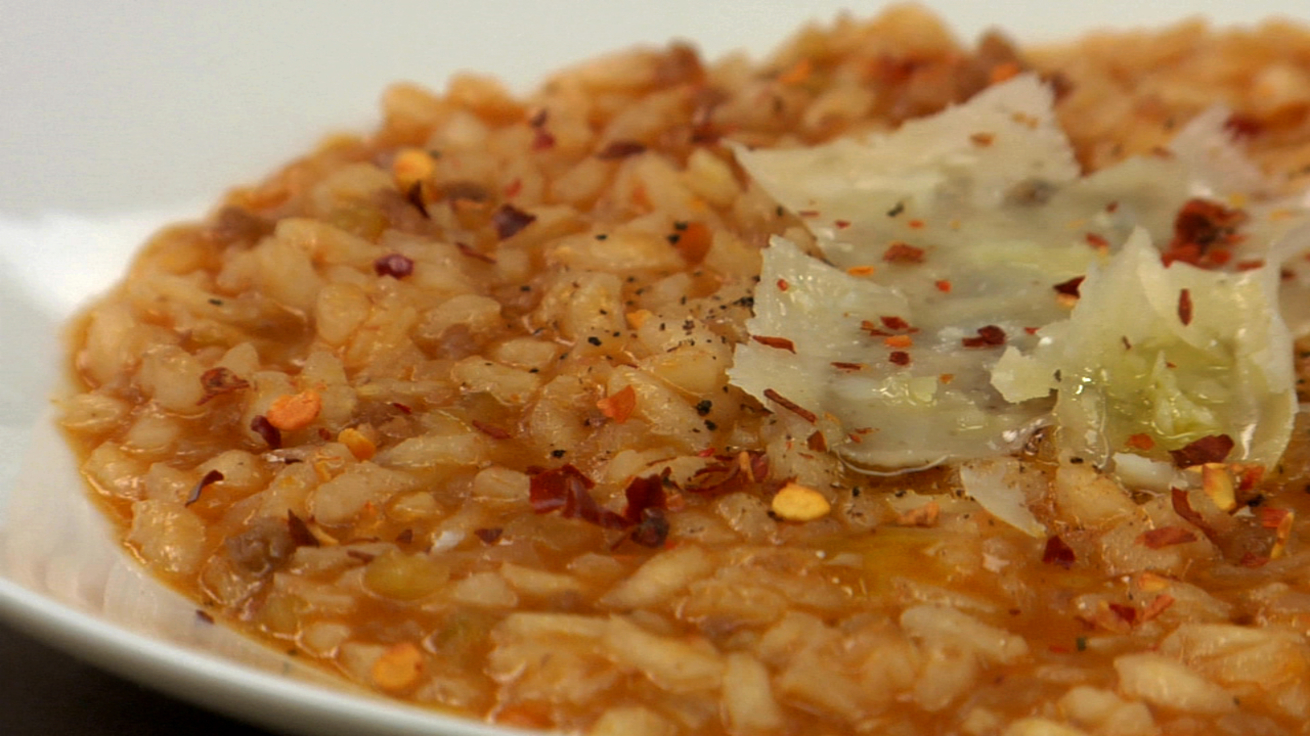 Just before serving, add a bit of hot liquid to loosen the consistency, if necessary. Plate on warmed dishes. Top with parmesan shavings, red chili flakes and a drizzle of extra-virgin olive oil, if desired. Serve immediately.