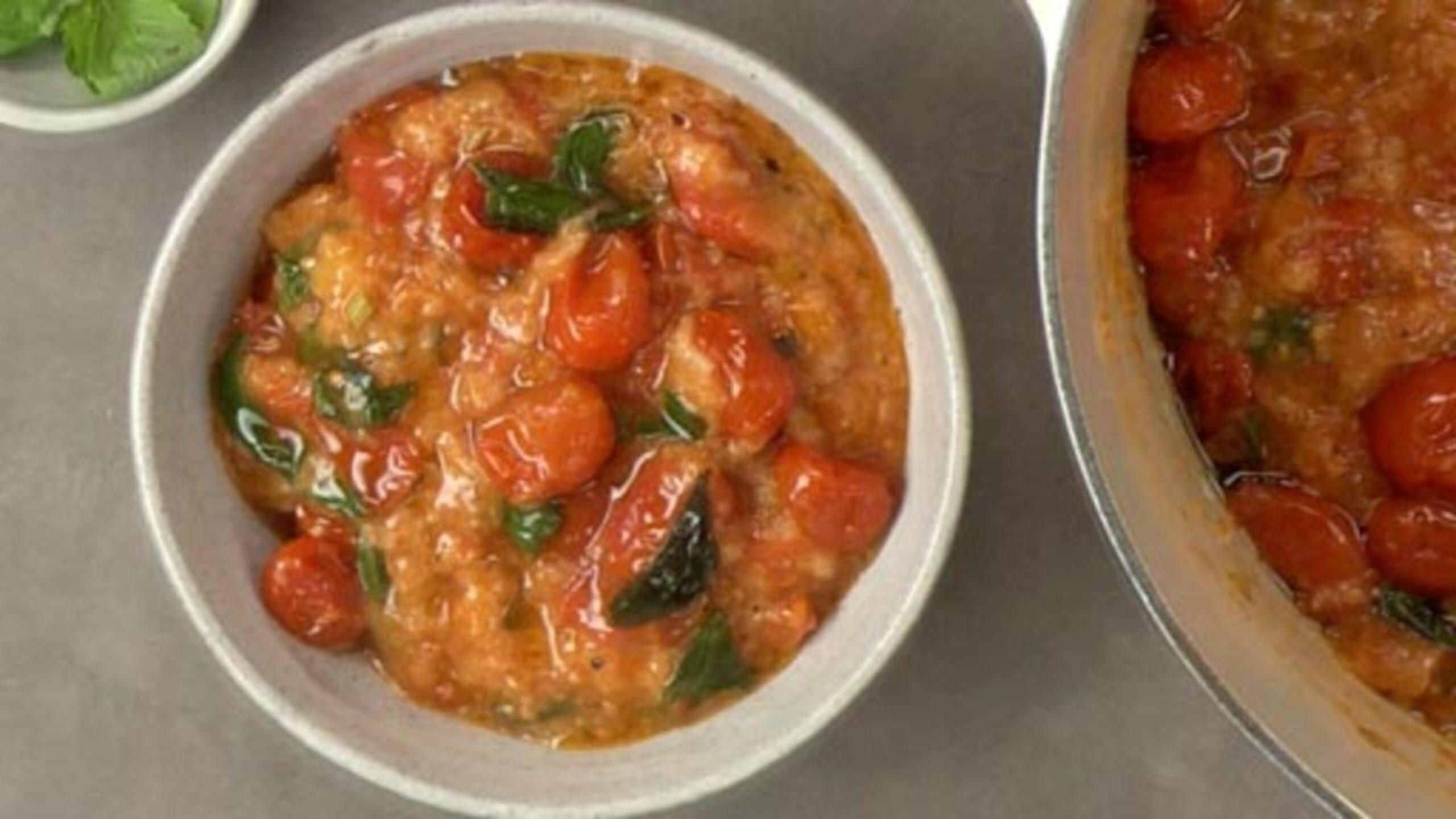 Prick the cherry tomatoes with a fork and place into a bowl. Emince the garlic and sprinkle over top. Remove the leaves from the basil stems (reserve the stems) and add one-quarter of the leaves to the bowl. Drizzle the tomatoes with olive oil and season with salt and pepper to taste. Toss to coat evenly.
