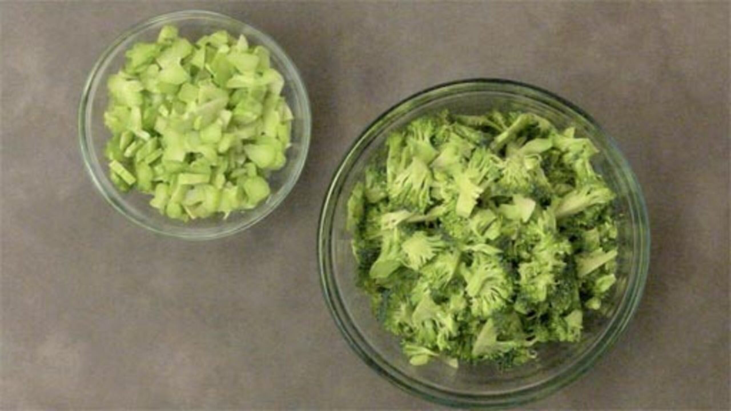 To prepare your mise en place, finely dice the onions and emince the garlic. Peel the broccoli stems (if there are any) and cut them into small, even pieces. Set aside. Chop the florets into small, even pieces and place into a separate bowl.