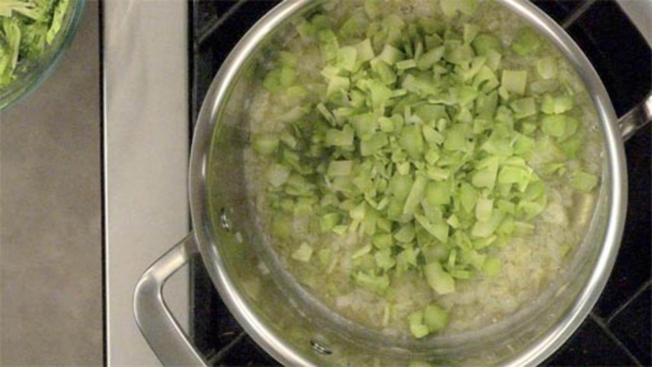 Add the broccoli stems (if there are any) and stir to coat with the fat. Continue to sweat for a few minutes until somewhat softened.