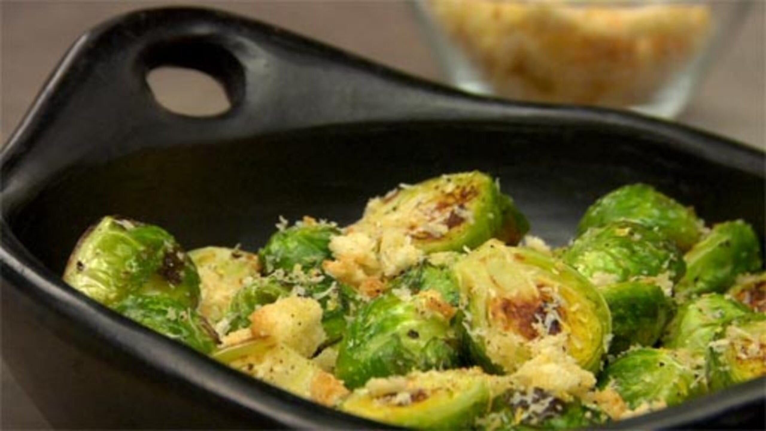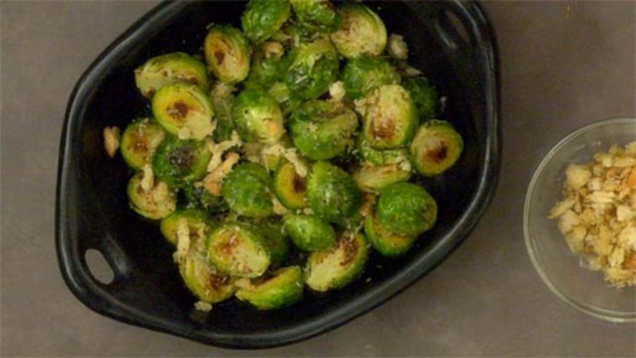 Once the Brussels sprouts are cooked to your liking, remove them from the oven. Place into a shallow serving dish and sprinkle the breadcrumbs over top. If desired, garnish with some Plant-Based Parmesan as well. Serve immediately.