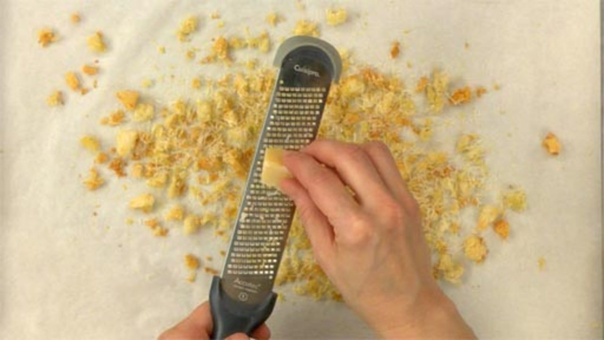 Remove the crust from the bread and place into a food processor. Pulse until you reach a coarse texture. Place the breadcrumbs into a bowl and toss with the olive oil. Season to taste with salt and pepper. Place onto a parchment-lined baking tray and bake until golden, tossing from time to time, about 10 minutes. Once done, zest the lemon over top. Toss to combine and set aside to cool.