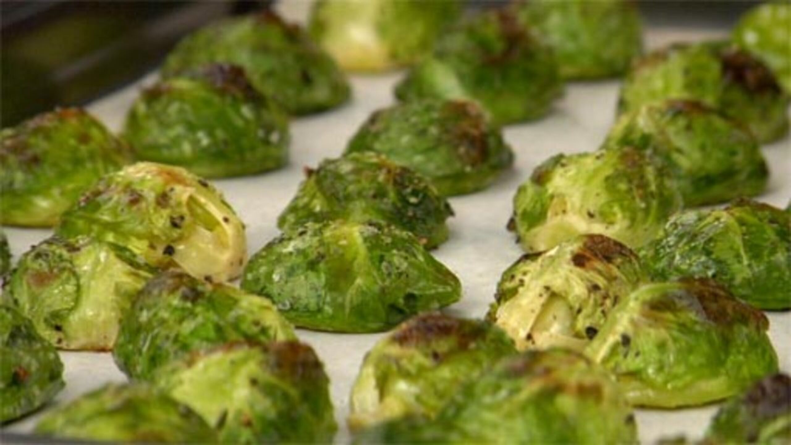 Wash, dry and trim the Brussels sprouts. Cut in half lengthwise. Place into a bowl and toss with the olive oil and salt and pepper to taste. Arrange cut-side down on a parchment-lined baking tray. Place into the oven and roast for 8 to 12 minutes or until golden, turning once, if necessary.