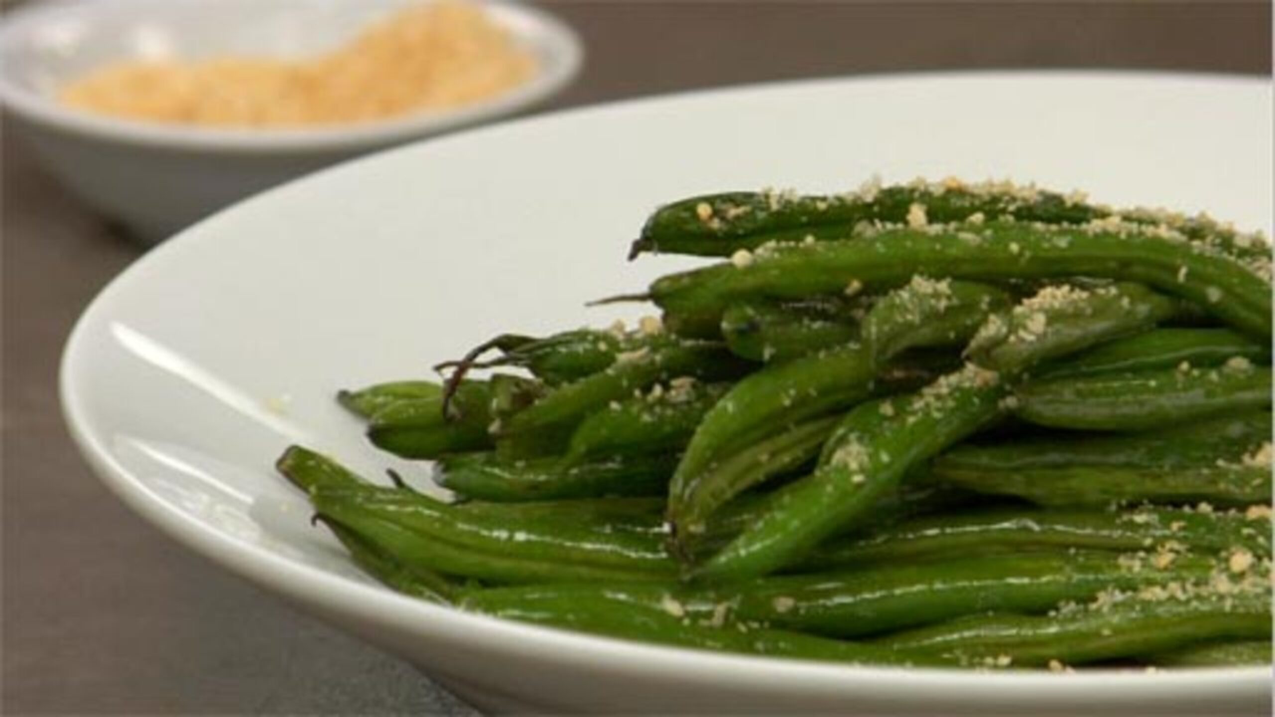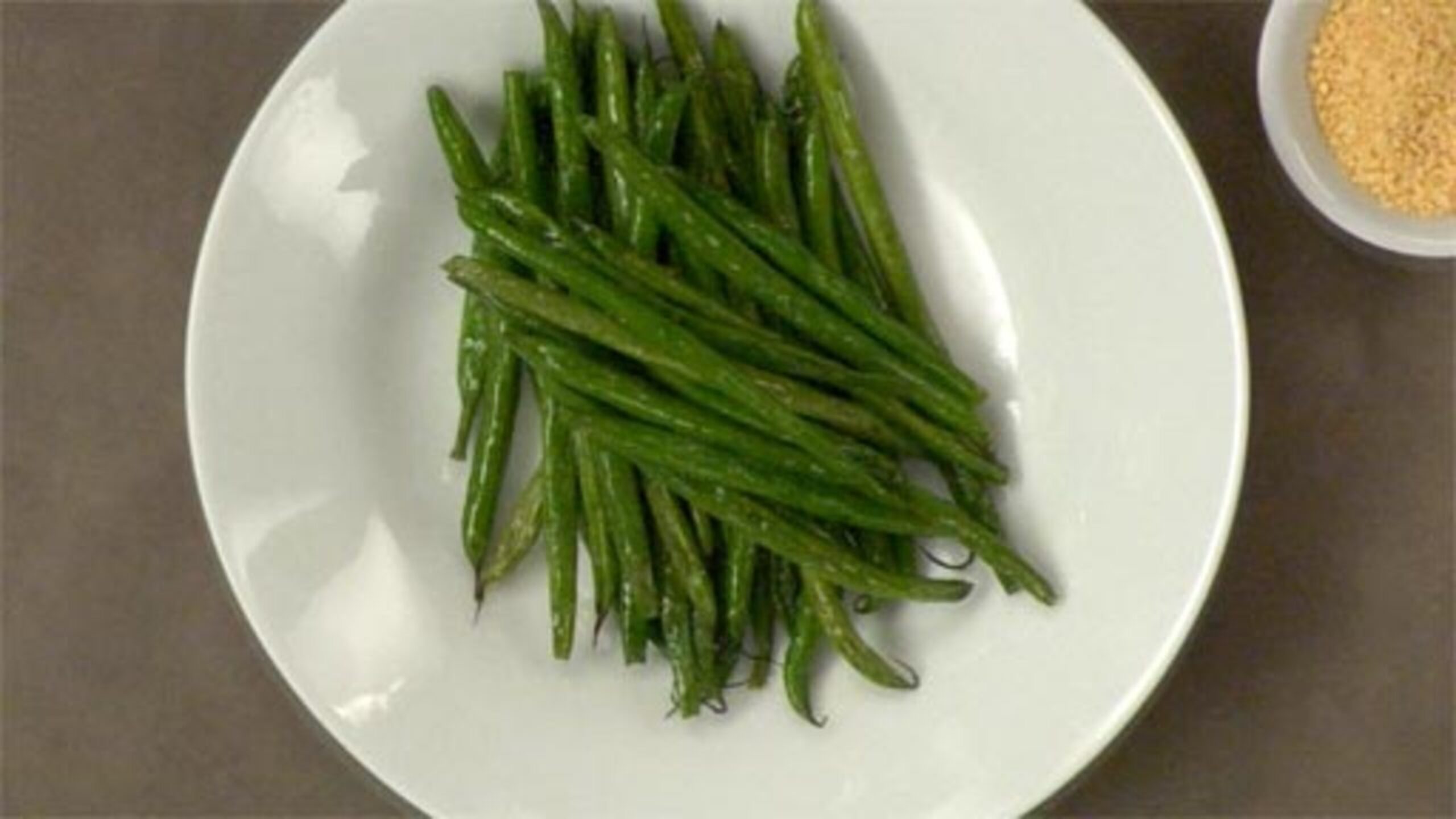 Wash, dry and trim the green beans. Place into a large bowl and toss with the olive oil just to coat. Arrange onto a parchment-lined tray and roast for approximately 5 minutes or until just starting to brown.