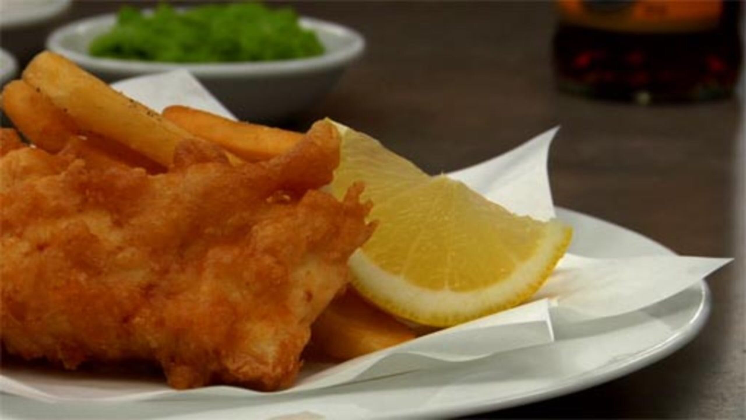 Once done, drain the fish and season with a bit of salt while it is still hot. Then either place into a warm oven or serve immediately with the chips/fries.