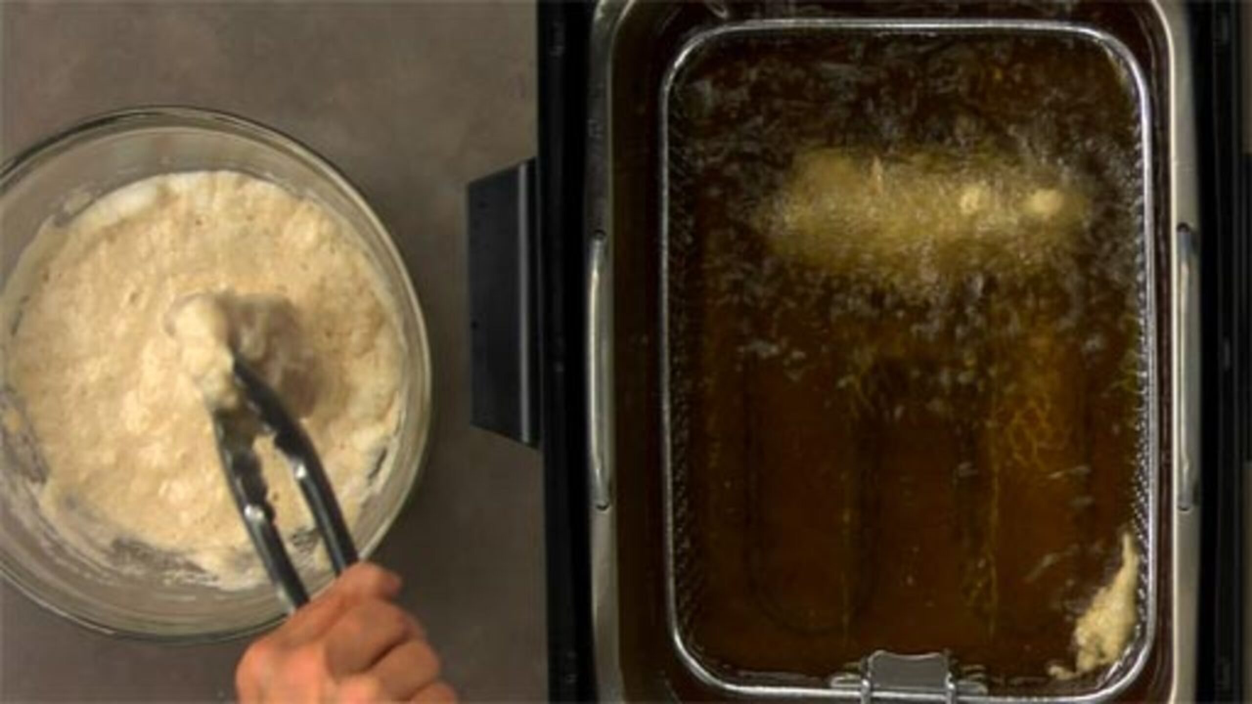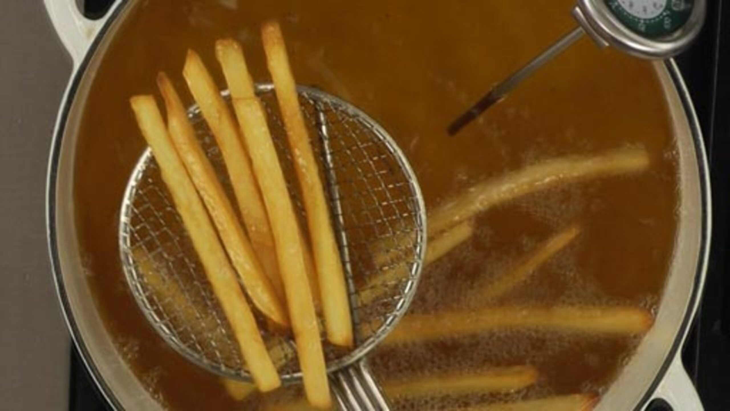 Before you start, make sure the oil is at the correct temperature (it should be between 350-375˚F or 180-190˚C).