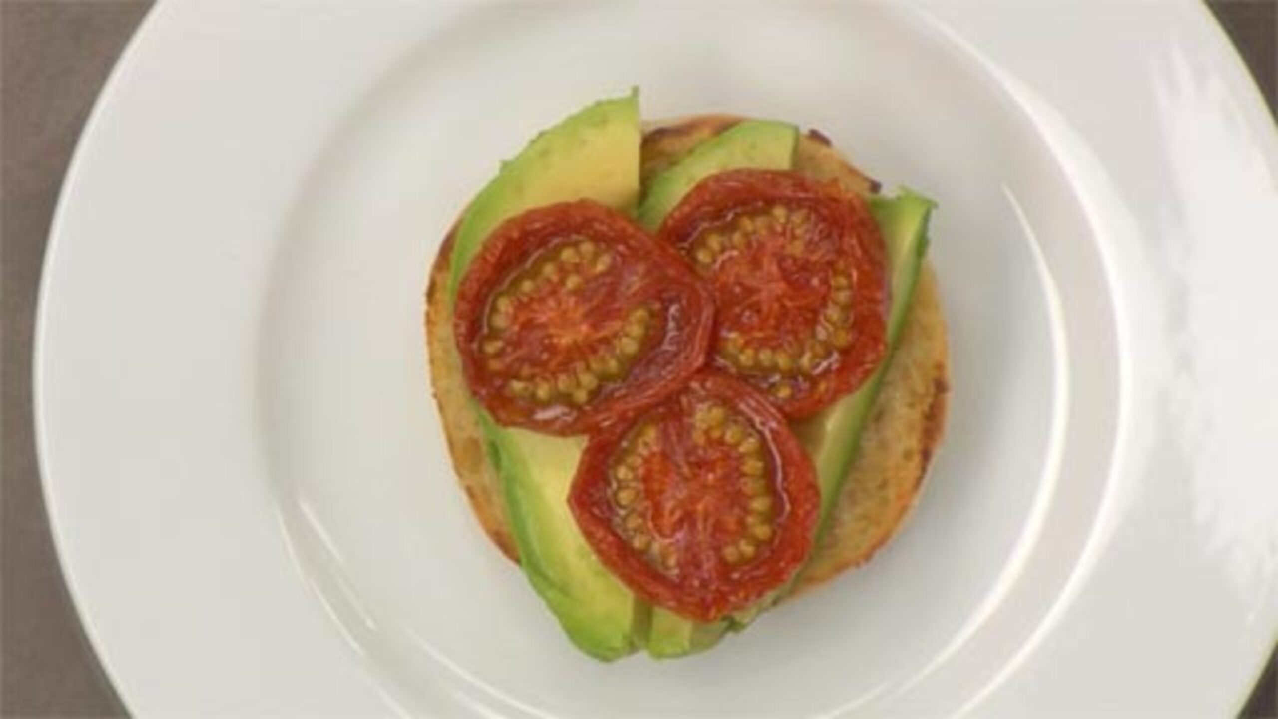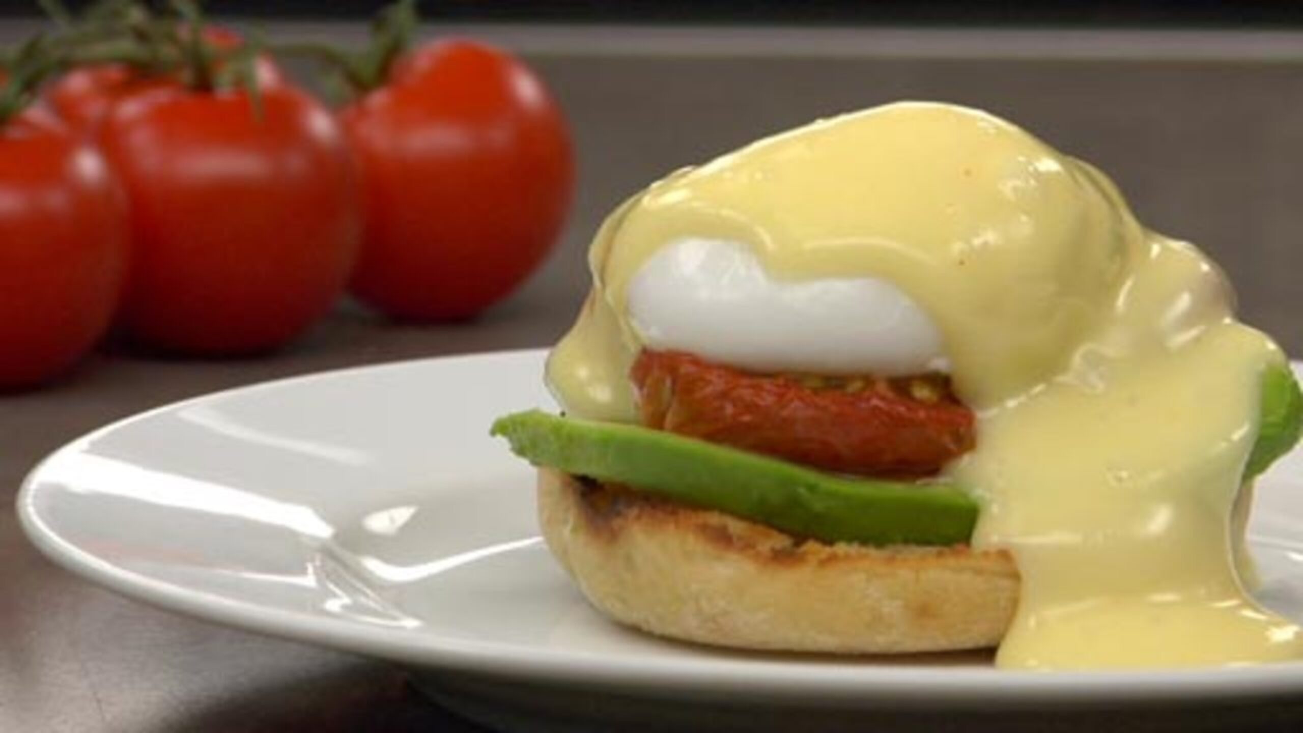 Once toasted, place 3 roasted tomatoes over each of the muffin halves. Thinly slice the avocado and fan the slices over the tomatoes. Top with a warmed, poached egg. Assemble 2 eggs on each plate (to serve 4) or 1 egg on each plate (to serve 8). Spoon the hollandaise sauce over top and serve immediately.