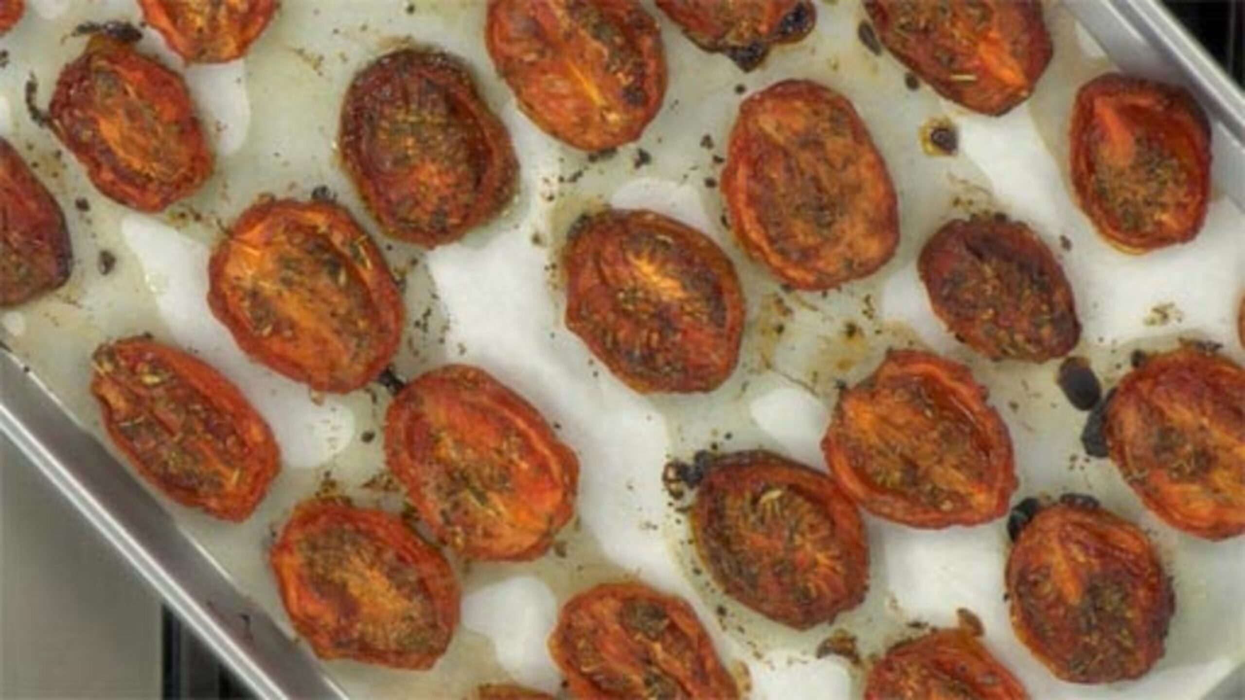 Slice the tomatoes in half. Place cut-side up onto a parchment-lined tray. Drizzle lightly with extra-virgin olive oil and salt and pepper to taste.