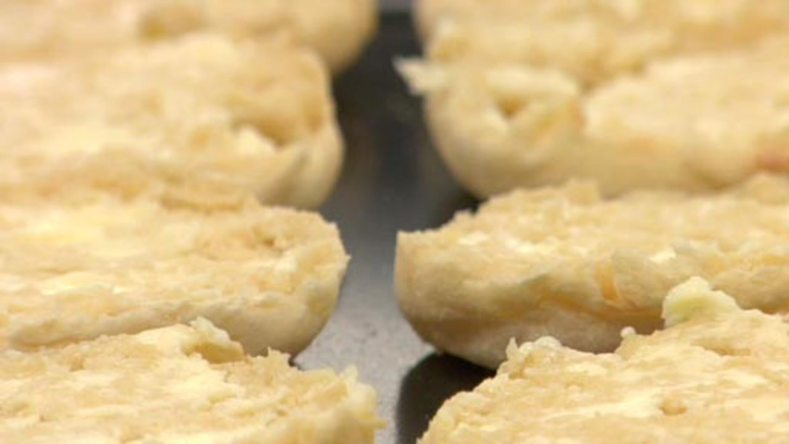 Using the tines of a fork, carefully pull the English muffins apart into two. Place onto a baking tray and lightly butter.