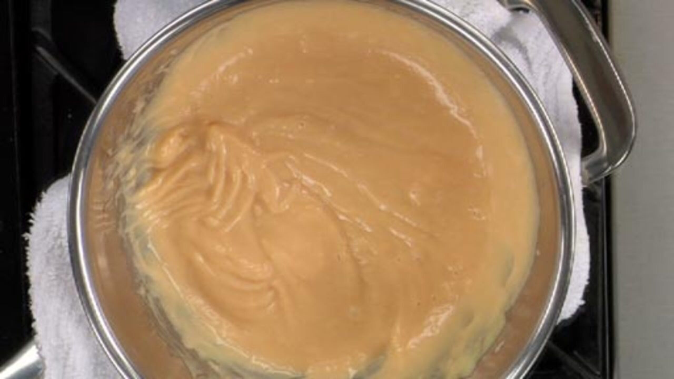 Discard the simmering water from the bain marie and place a damp cloth over the pot. Place the bowl with the sabayon over top. Make sure the butter is between 130-140 degrees Fahrenheit (55-60 degrees Celsius). While constantly whisking, add the butter to the sabayon in a steady stream. Add enough butter until you achieve a somewhat thick consistency. You will not need all of the butter, but it is better to have more on hand than too little.