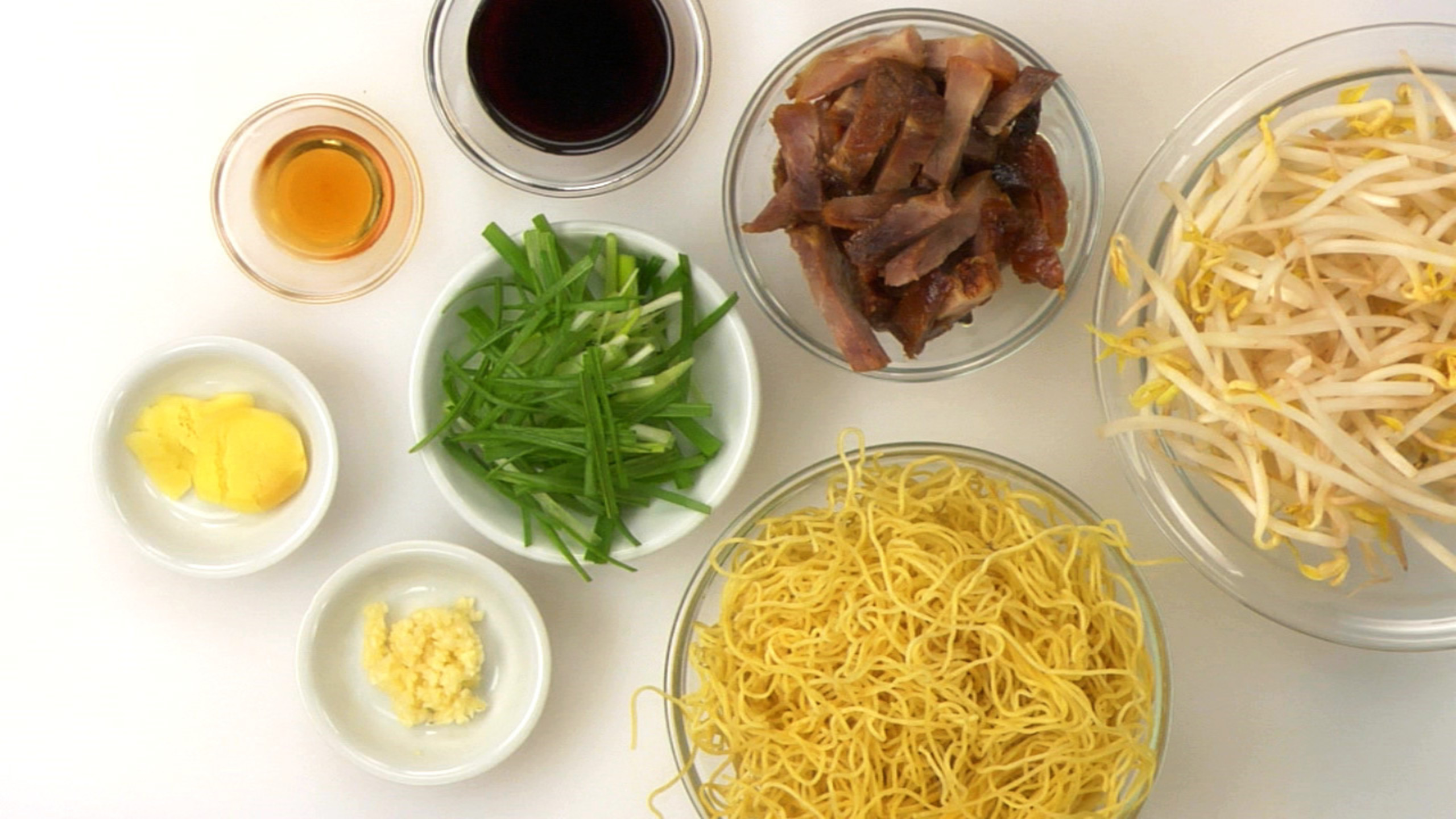 Next, smash the ginger slices with your knife and mince the garlic. Slice the green onions in half vertically and then into 2" -inch pieces. Wash and spin dry the bean sprouts. Measure out the Shao Hsing rice wine into a small container. Cut the pork into matchstick pieces and set everything aside.