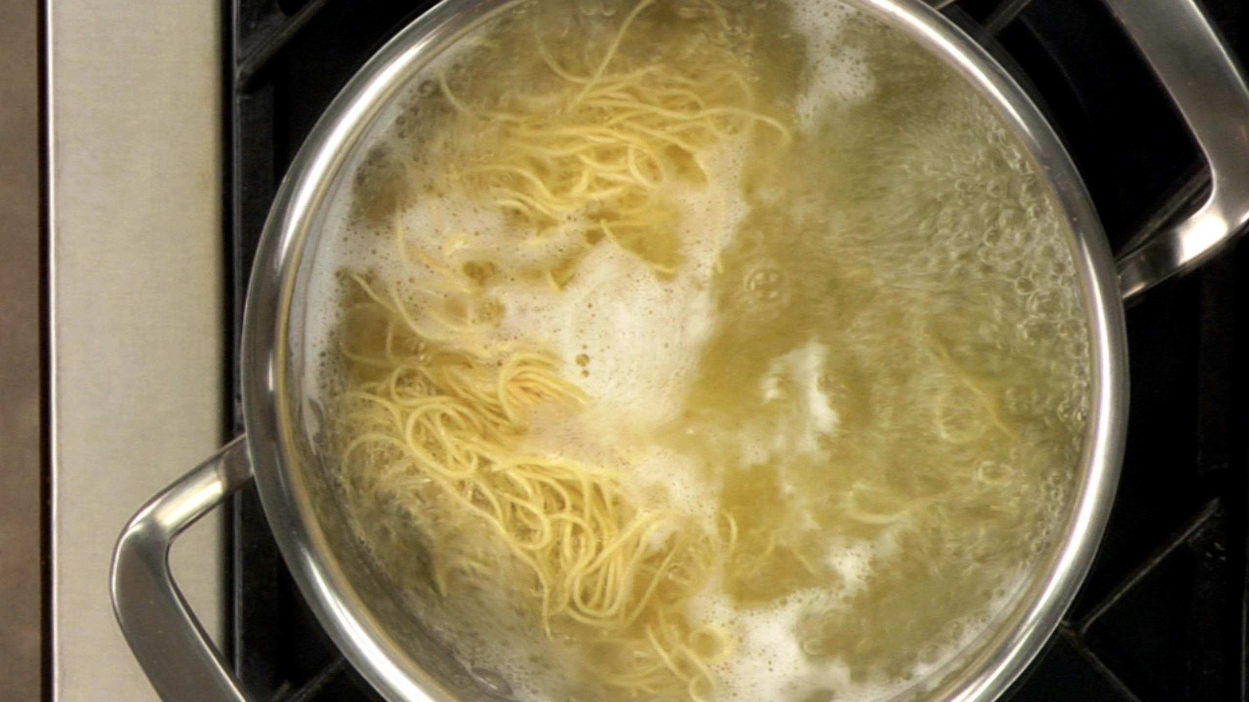 To cook the noodles, bring a large pot of water to a boil. Add the noodles. Once boiling, cook for approximately 3 minutes (or according to the directions on the package) or until the noodles are almost entirely cooked through. Once done, drain the noodles into a colander and rinse with cold water. Drain well to remove the excess water. Place the oil into the pot and add the noodles. Toss to coat with the oil.