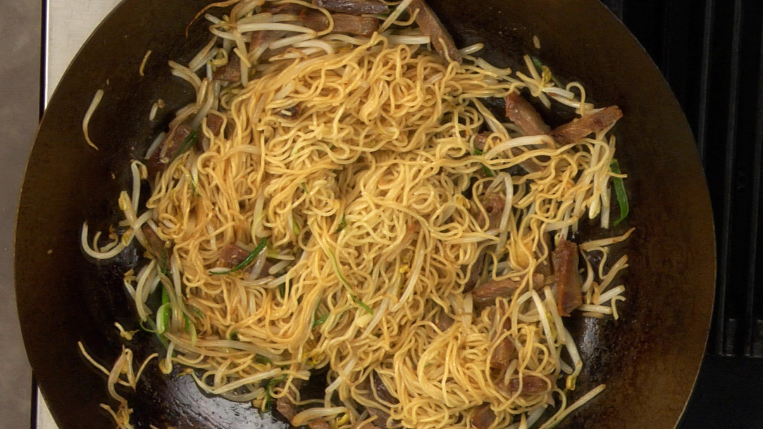 Next, add the bean sprouts and Shao Hsing rice wine. Toss and stir-fry for about 30 seconds or until the bean sprouts just begin to soften. Add the sauce, noodles and green onions. Stir-fry for another 1 to 2 minutes until the noodles and ingredients are completely heated through and evenly coated with the sauce. Serve immediately.