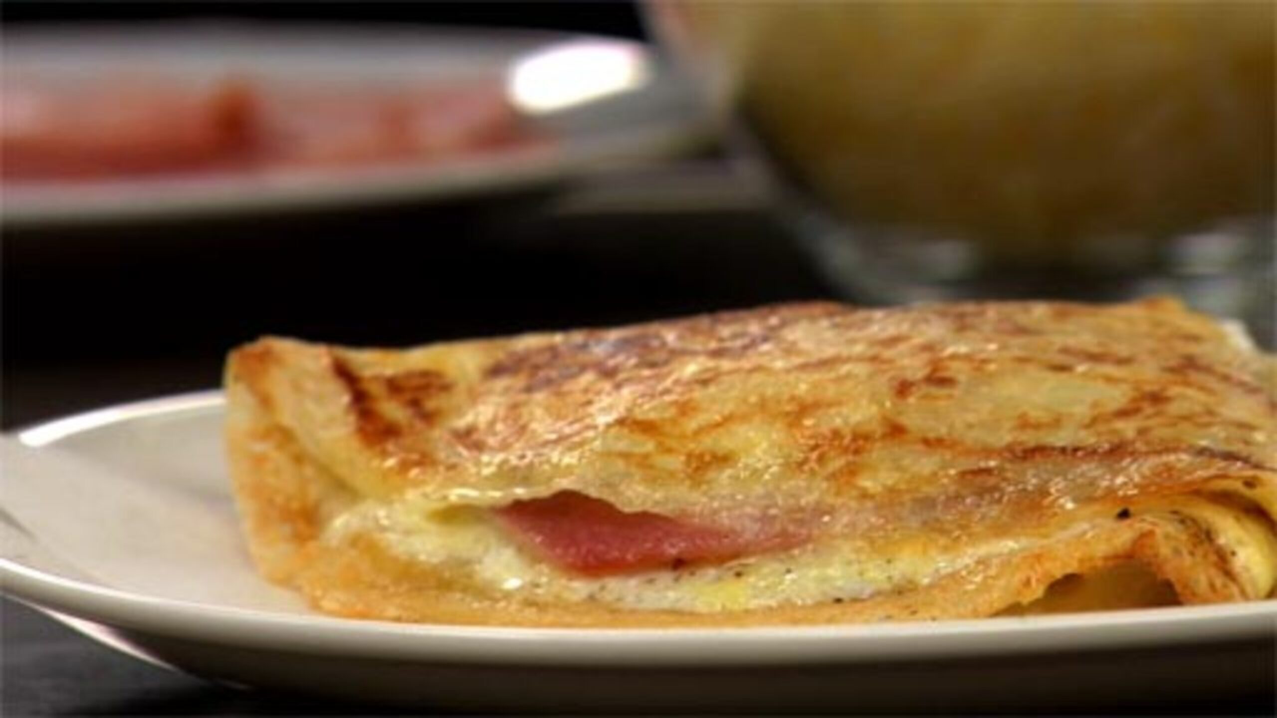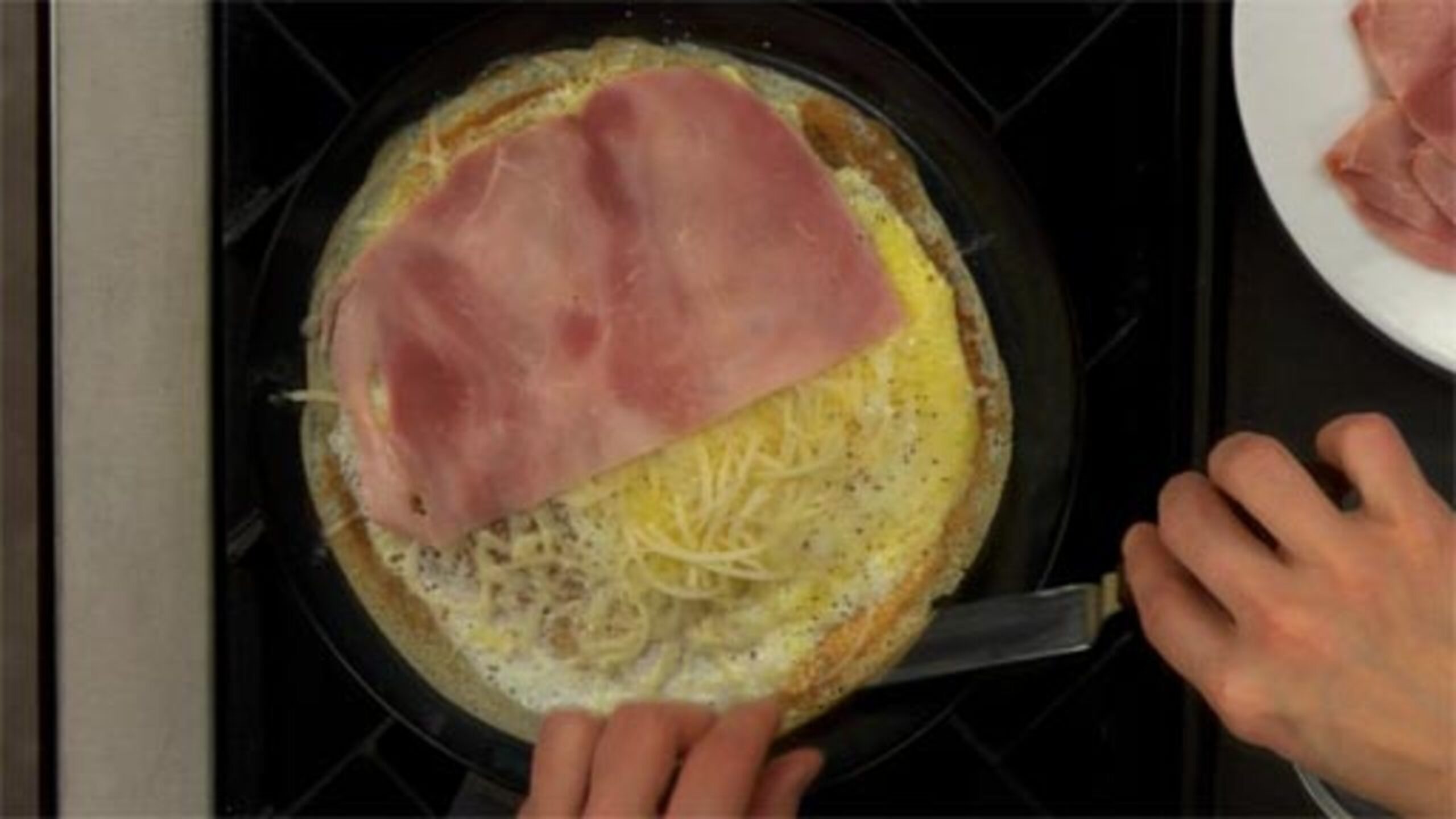 Place a piece of ham on one half of the crêpe. Monitor the heat (you may need to turn it down slightly).