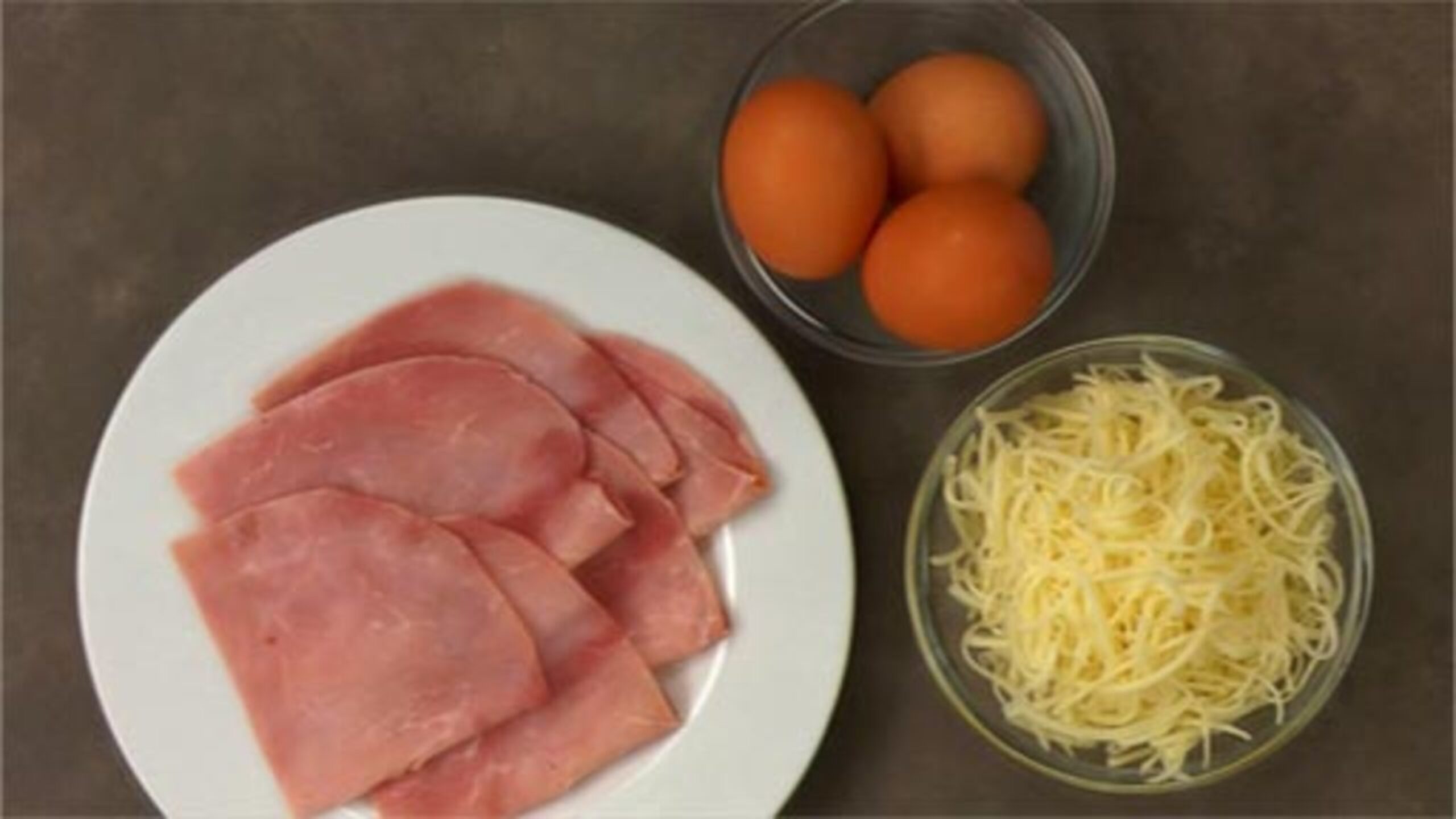 Gather the eggs and ham. Shred the Gruyere cheese. Set aside.