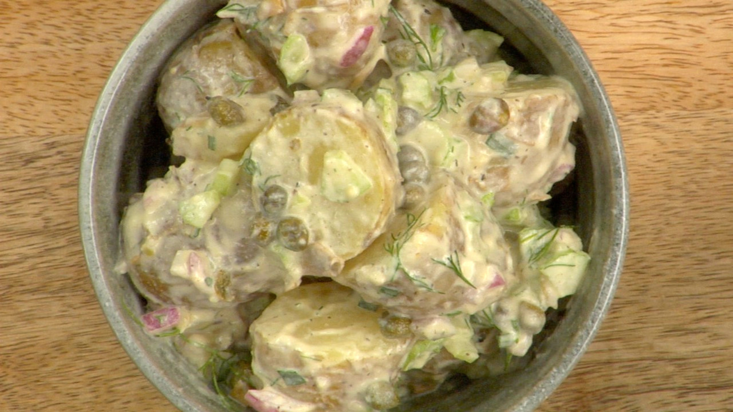 Serve these potatoes as a side or as part of a picnic, or top with greens, such as watercress. The spiciness from the watercress is a nice balance to the richness of the dressing.