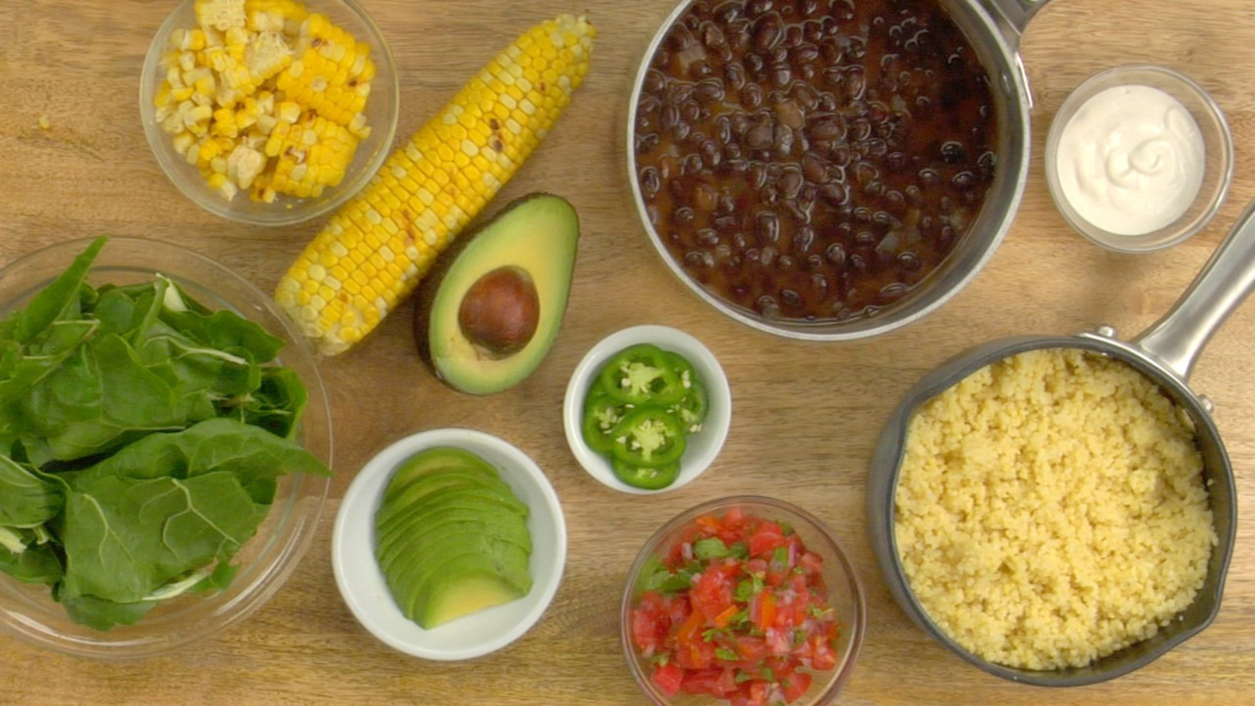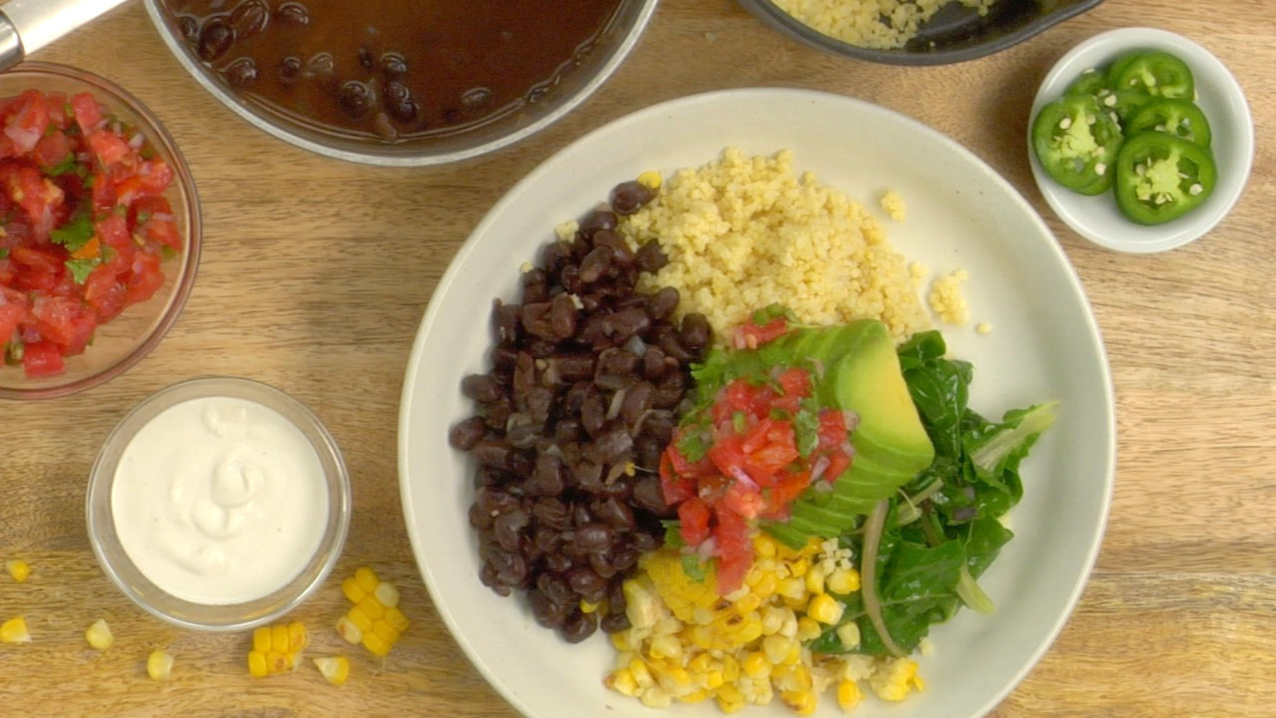 Evenly place the millet, black beans, kale and corn into bowls.
