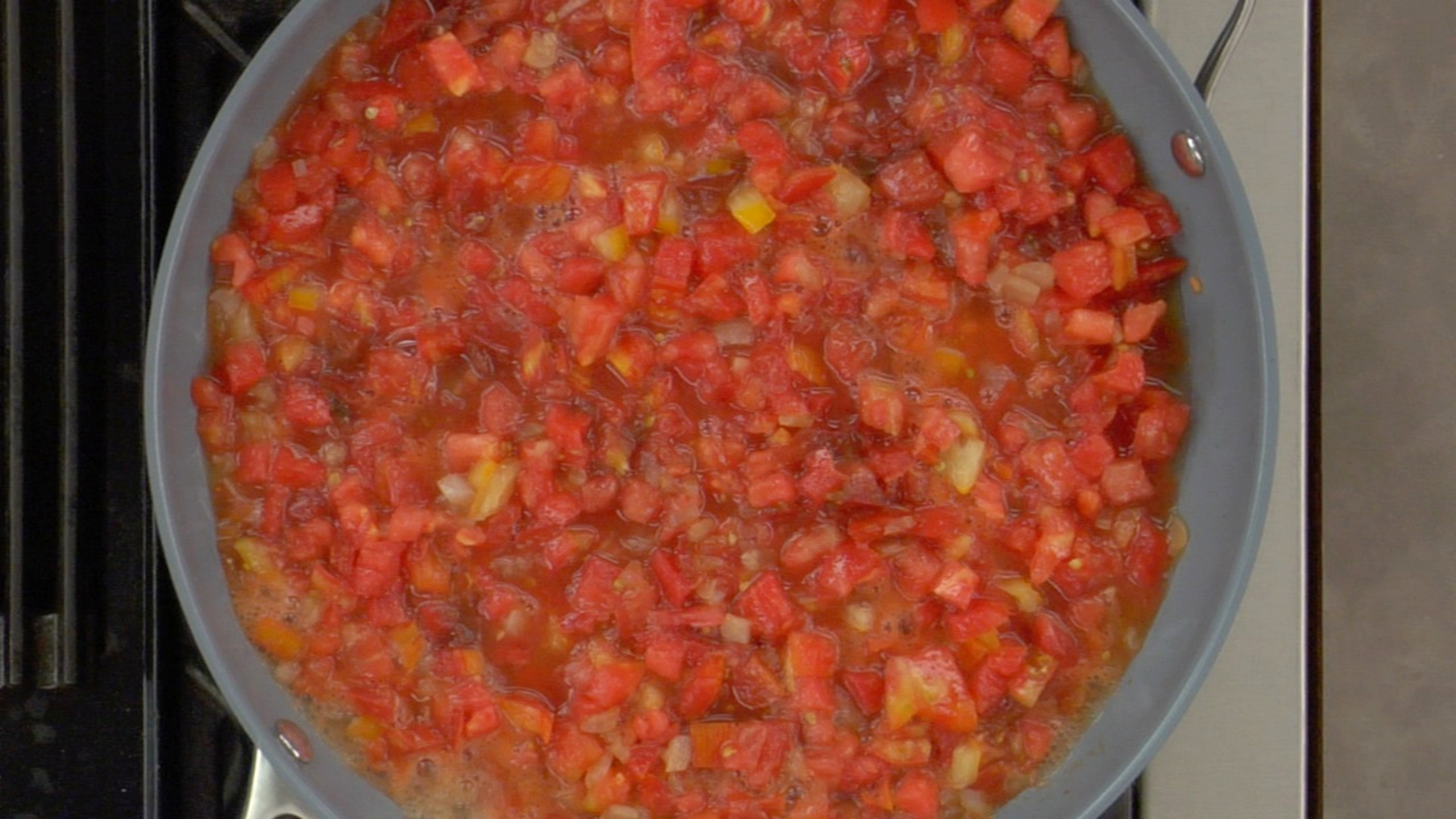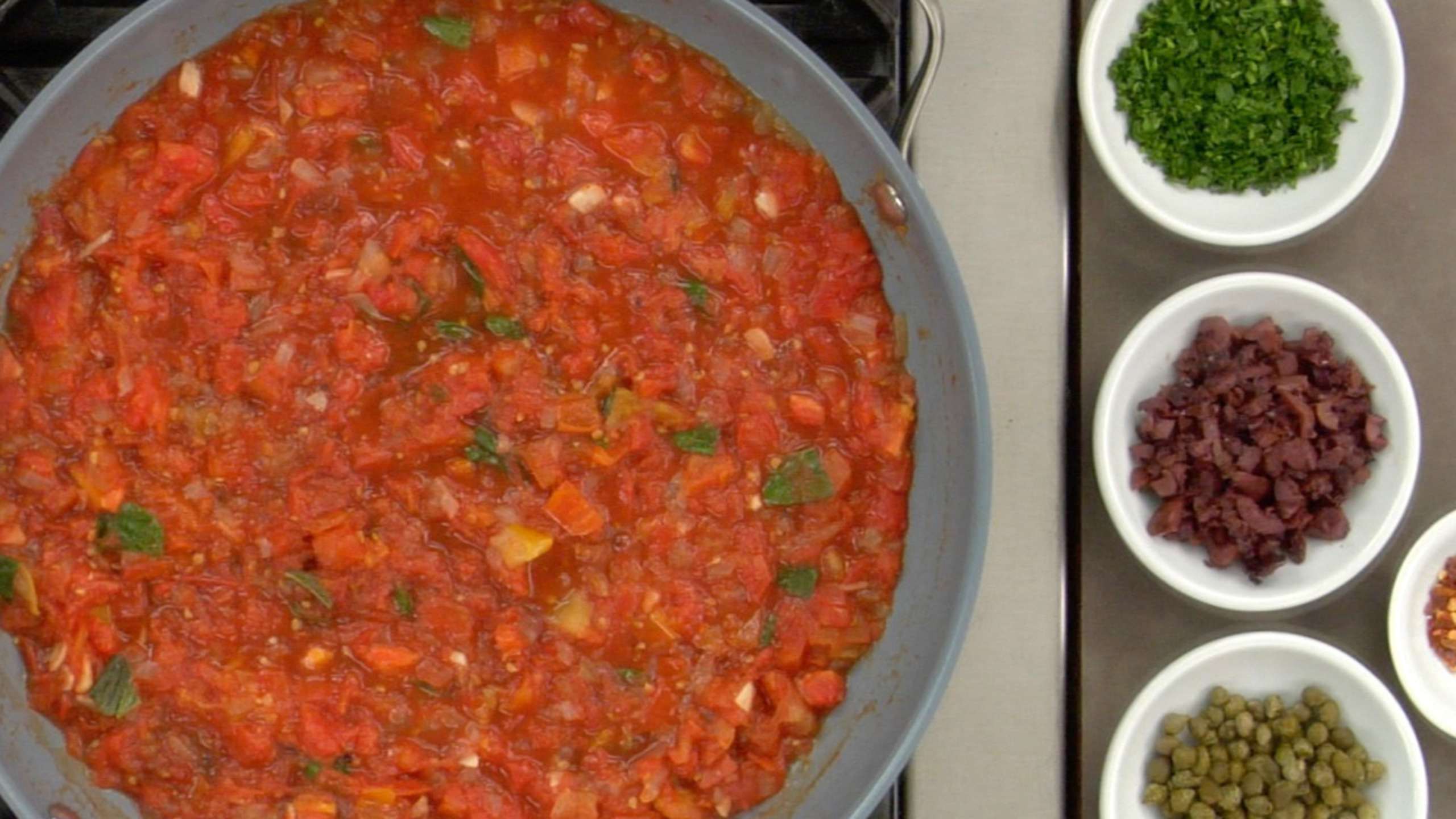 To prepare the sauce, in a large fry pan, add the Pomodoro Sauce. Fold in the fresh basil, capers, olives, chile flakes and parsley.