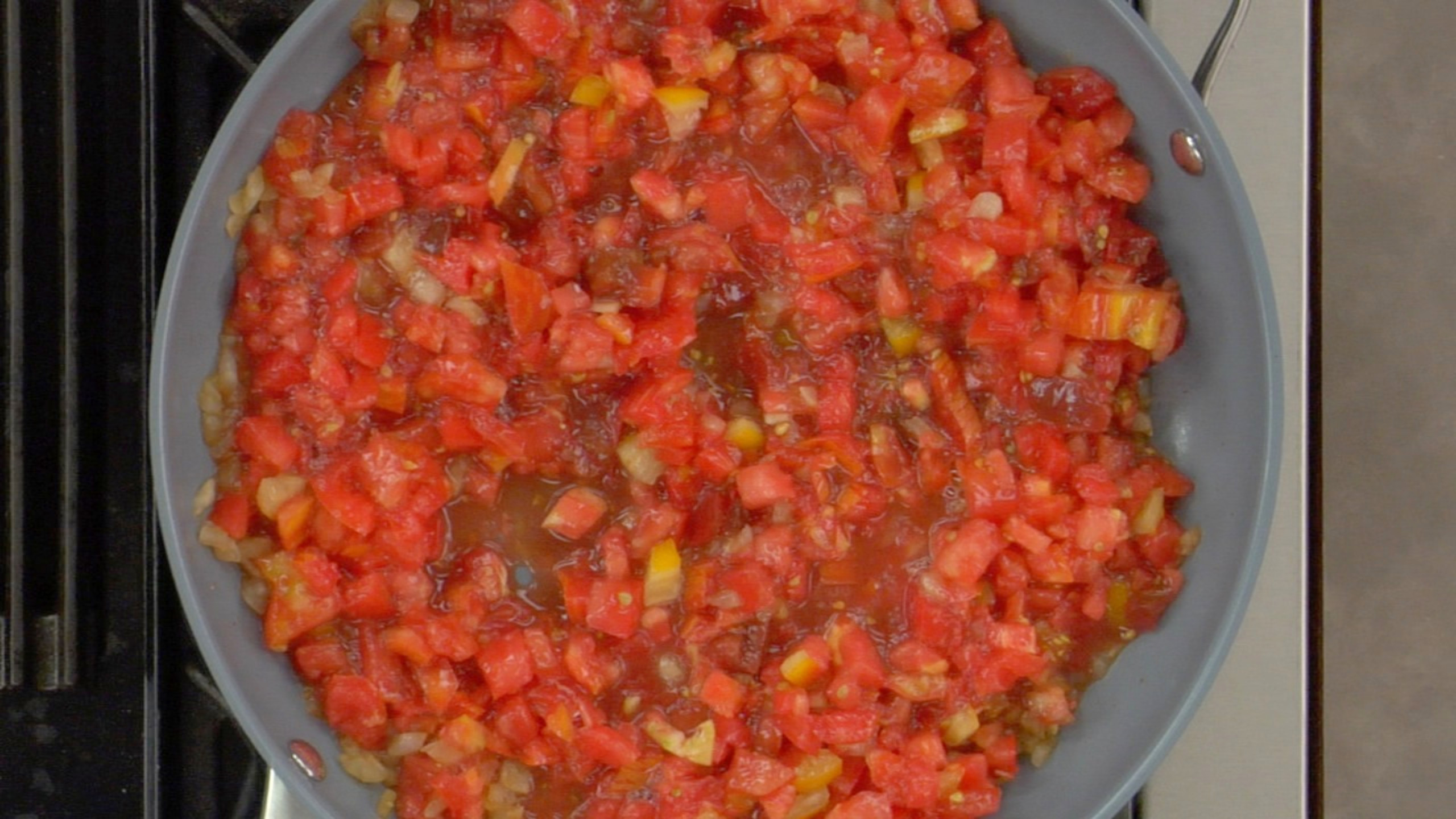 To finish the sauce, add the tomatoes and cook on medium–low heat for 20 to 25 minutes — tossing or stirring to be sure they do not stick. Add freshly-ground black pepper and remove from heat.