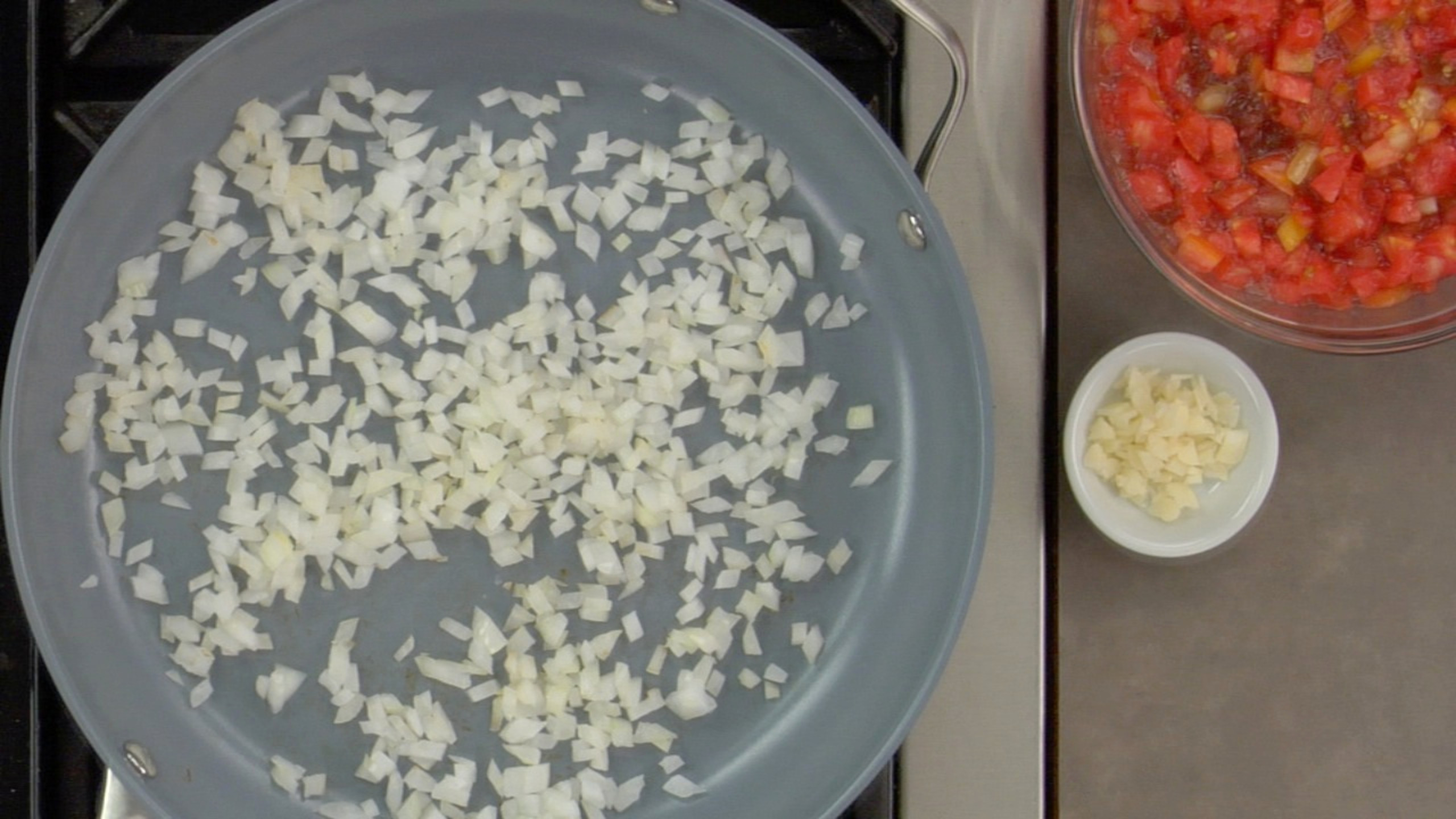 Next, preheat a large fry pan over medium-high heat and then dry sauté the onions until they start to soften and brown slightly. At this point, add the garlic and let cook for 30 seconds or so.
