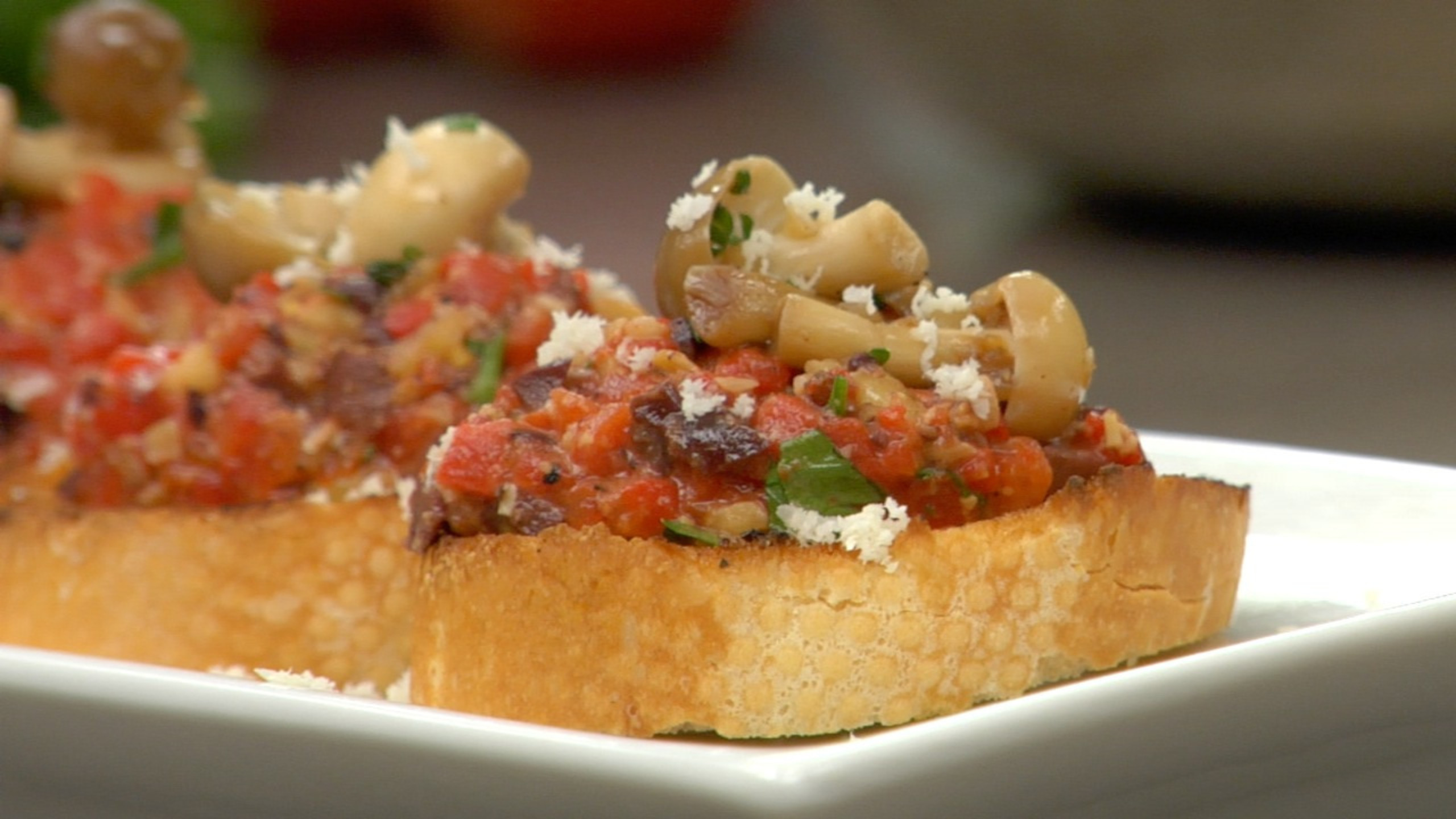 To assemble, lay out the crostini slices onto a plate or platter. Top each slice with approximately 1 to 2 tablespoons of the pesto, followed by a small amount of the Garlic Mushrooms.