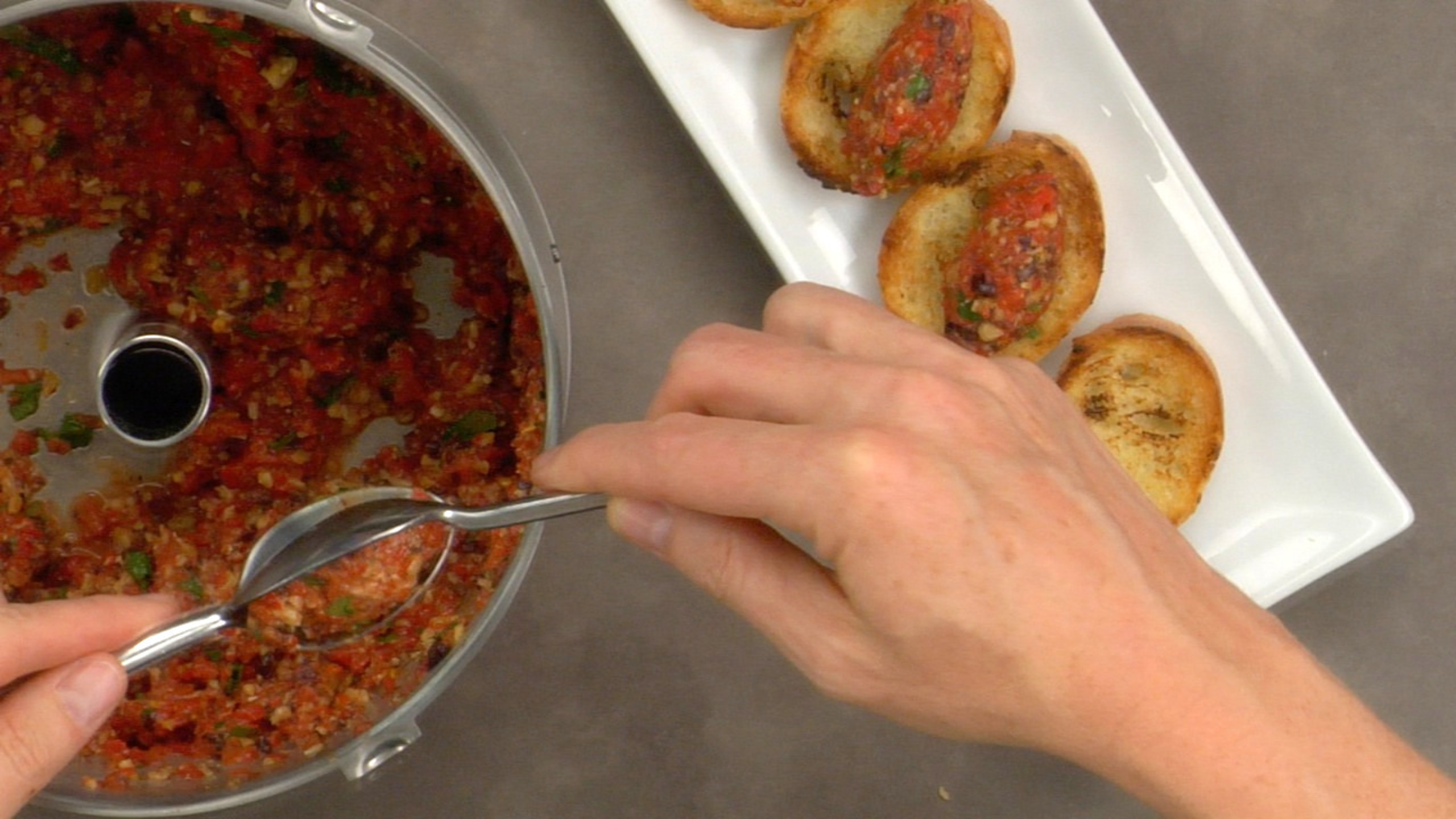 Using a fine zester, shave the fresh horseradish root overtop of the crostini and serve immediately.