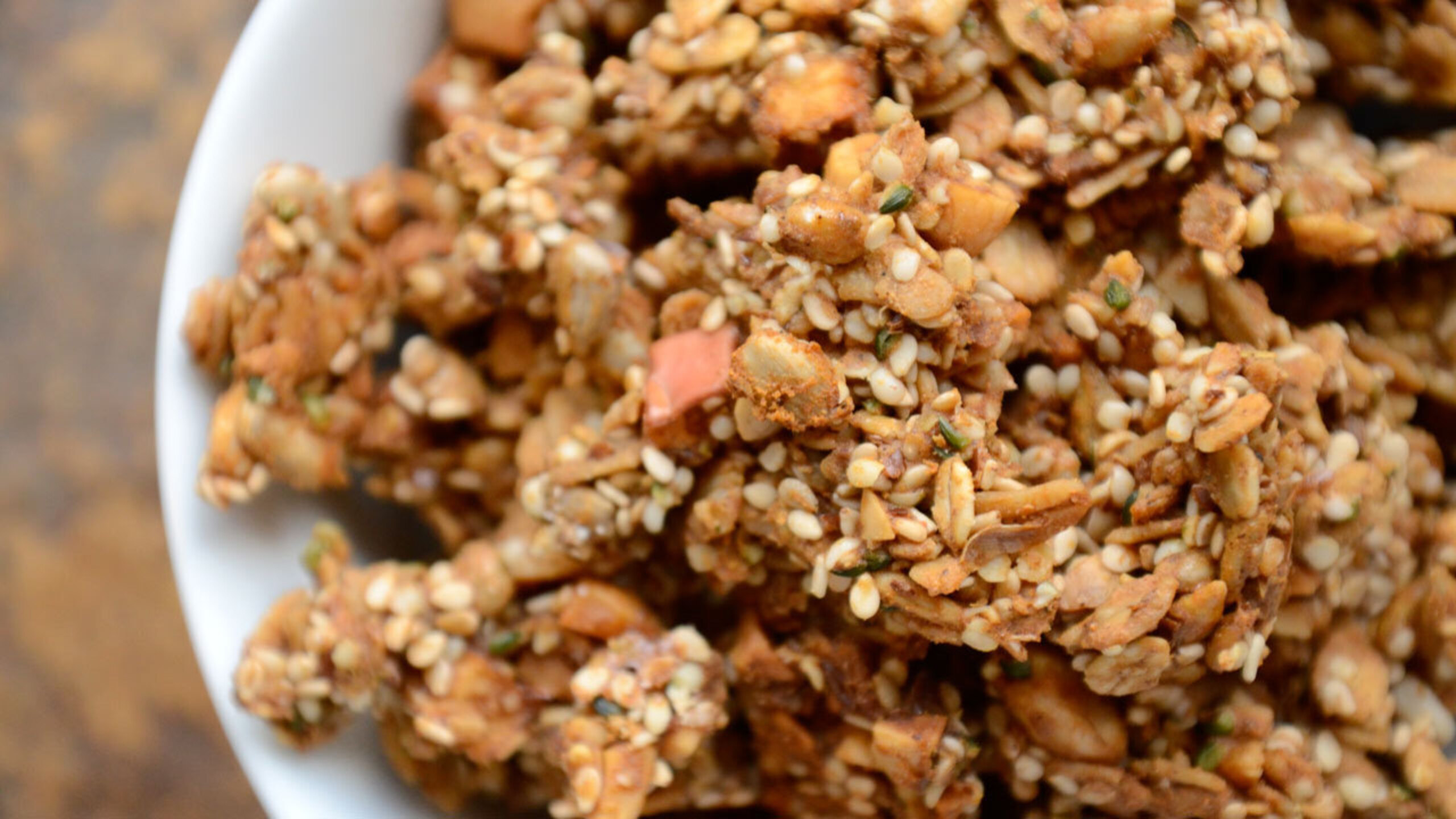 It is important that the granola be baked at a low temperature so that the oil and the fragile oils in the seeds do not go rancid, causing a bitter flavor and creating toxicity in the body. To preserve the integrity of these essential omega oils, it is important to store this granola in the fridge, away from heat and light.