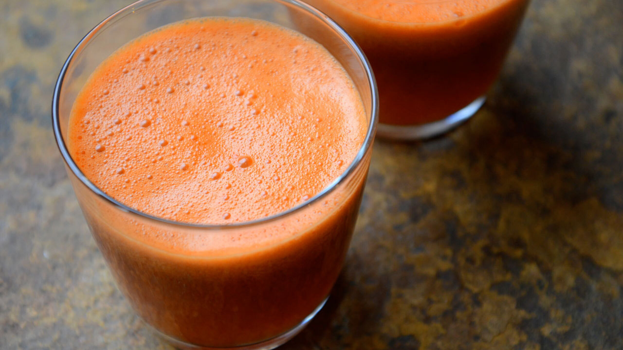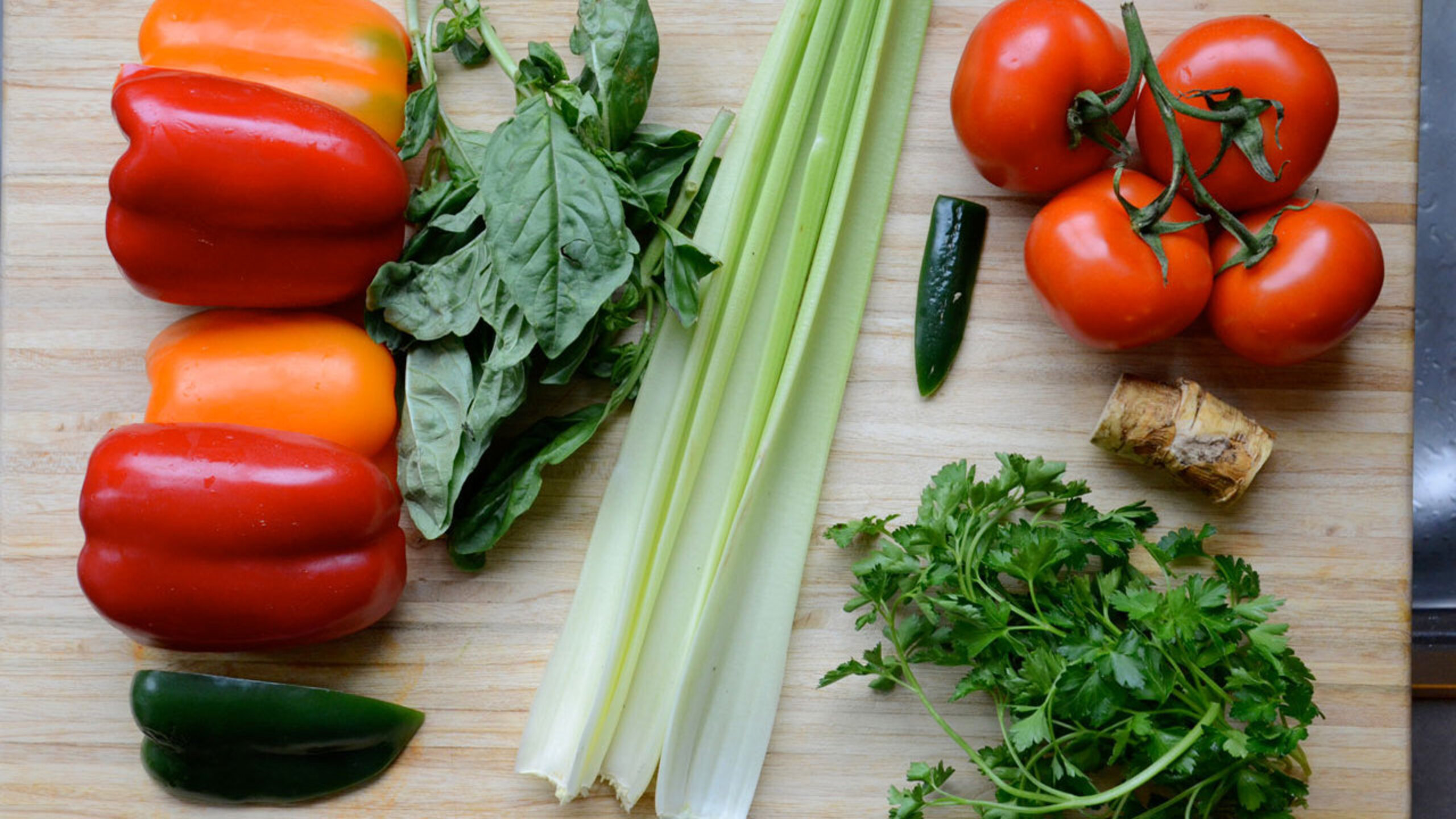To prepare the juice, wash all of the ingredients. Cut and deseed the peppers. If you like, you can use either two red or two orange peppers, instead of one of each.