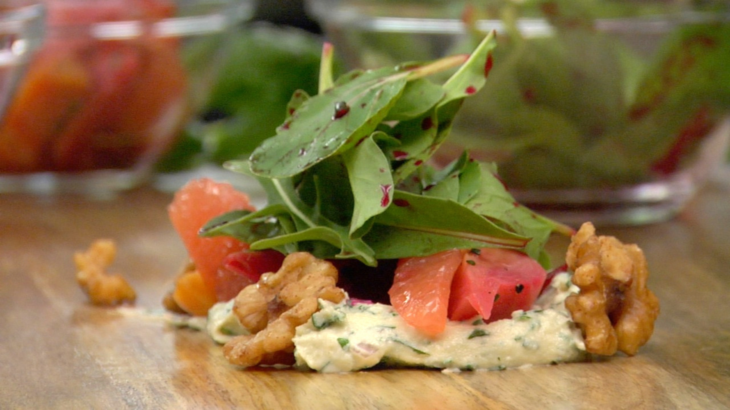 To plate, add a dollop of Cashew Herbed Cheese to the plate, smearing in a line. Assemble each plate by placing the beets, citrus segments and Maple Chipotle Candied Walnuts on top of the cheese. Top with baby greens. Sprinkle with flaked sea salt and serve.
