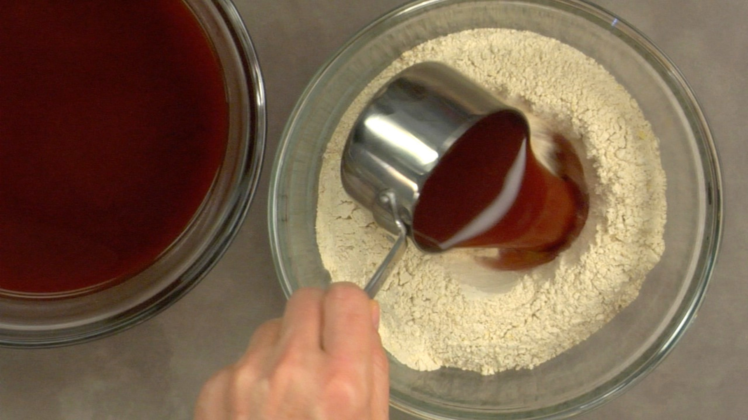 In separate bowl, mix the wet ingredients, reserving 1 cup of the vegetable stock and whisk well to ensure all is mixed thoroughly. Add the rest of the vegetable stock and thoroughly combine.