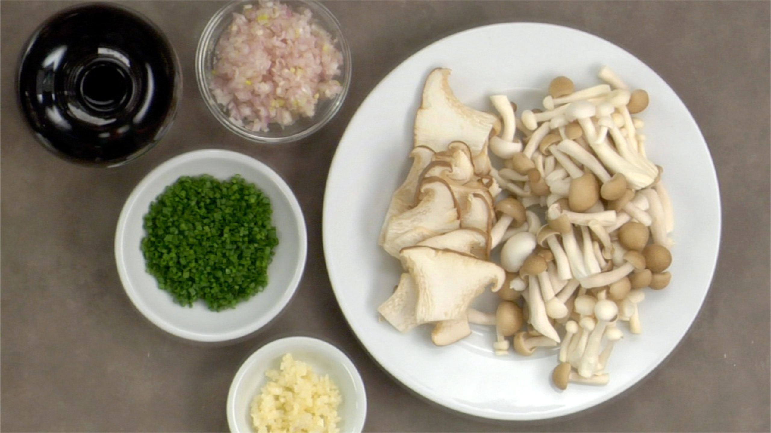 First, gather and prepare your mise en place. For the mushrooms, depending on their size you may need to cut up a few of the bigger ones. Leave some whole or in bigger pieces to give the dish more contrast.
