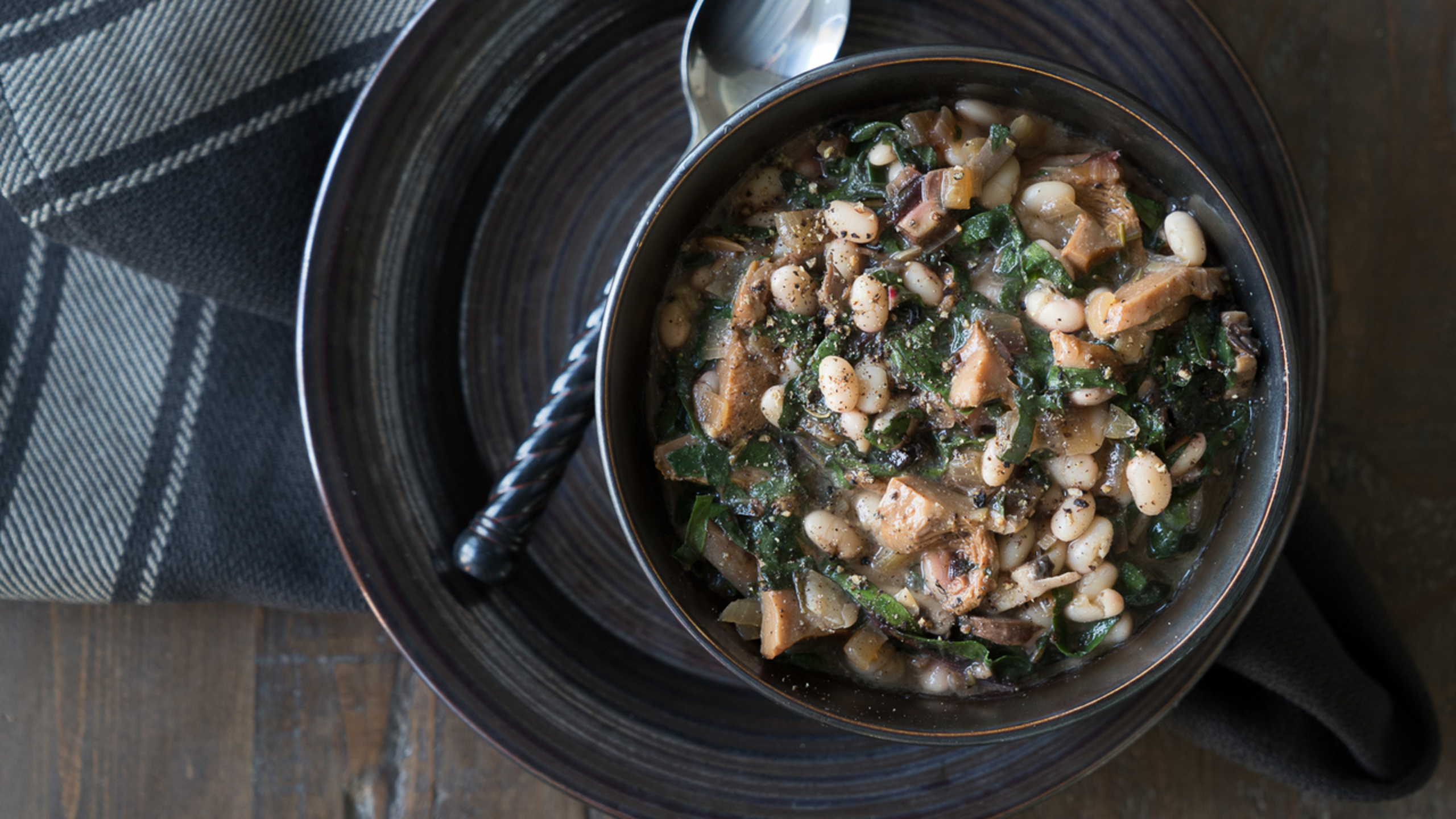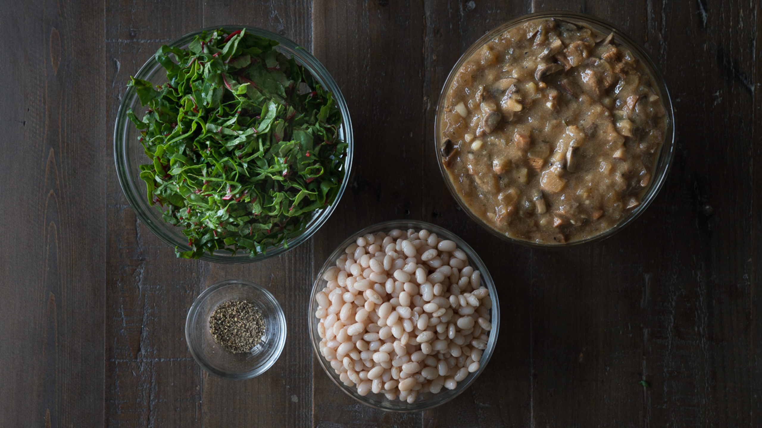 In a medium sauce pan, bring the No-Oil Mushroom Gravy to a simmer. Remove from the heat and then add the white beans, leafy greens and freshly-ground black pepper. Stir well and then simmer for 2 to 3 minutes, or until the greens have just started to wilt and become vibrant.